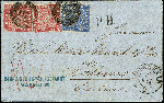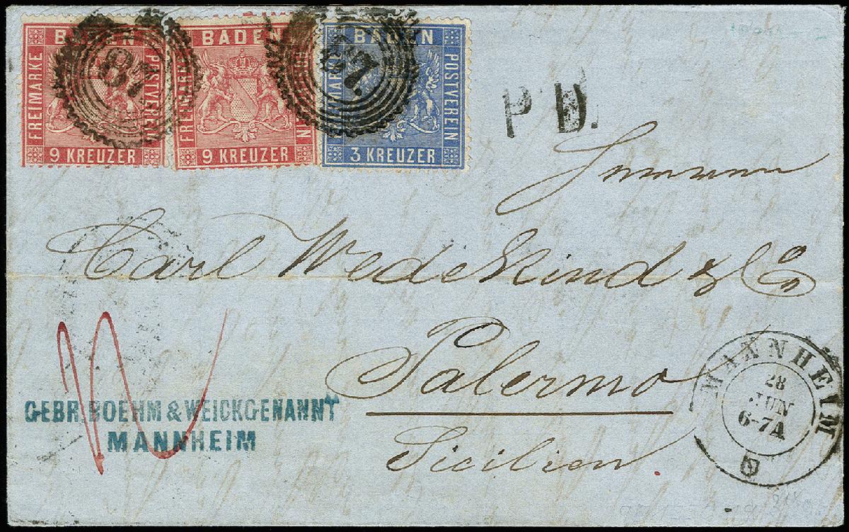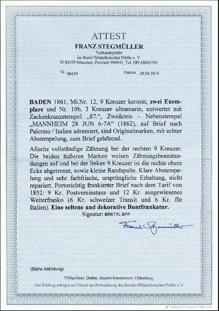 | Zusatzinformationen und Suchstichworte: | 371. Auktion Heinrich Köhler 24.-28. September 2019 Los 2521 1860/61, Wappen eng gezähnt 9 Kr. karmin, 2 Einzelwerte zusammen mit 3 Kr. ultramarin, als Streifen geklebt mit Zackenkranz "87" und nebengesetztem DKr. "MANNHEIM 28 JUN" (1862) auf Faltbrief über die Schweiz nach Palermo, Königreich Italien mit ausgewiesenem Weiterfranko von "12" Kr. ( 6 Kr. Schweizer Transit + 6 Kr. italienisches Porto); 2 Werte recht unauffällige Zahnfehler und einer zusätzlich kleiner Randspalt, sonst frische und attraktive Erhaltung. Eine seltene Auslandsfrankatur. Sign. Brettl BPP und Fotoattest Stegmüller BPP (2019) Zuschlag 750,00 EUR |
