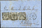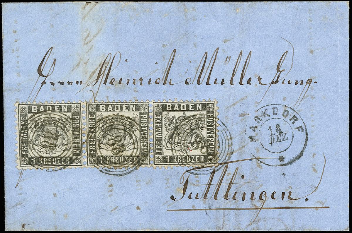 | Zusatzinformationen und Suchstichworte: | 371. Auktion Heinrich Köhler 24.-28. September 2019 Los 2522 1862, 1 Kr. grauschwarz im waagerechten 3er-Streifen, farbfrisch und überwiegend gut gezähnt (lediglich bei der linken unteren Marke 3 Zähne verkürzt) mit sauber aufgesetzter Nummer "88" und nebengesetztem DKr. "MARKDORF 18 DEZ" (1866) auf Faltbrief nach Tuttlingen. Eine schöne und seltene Streifenfrankatur dieser seltenen Nuance. Fototattest Stegmüller BPP (2014) Zuschlag 1.250,00 EUR |
