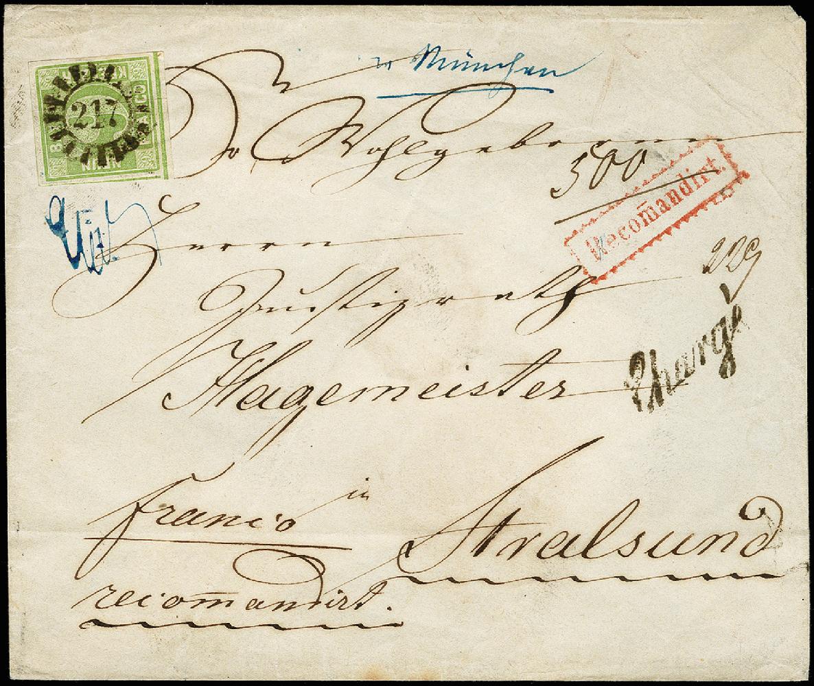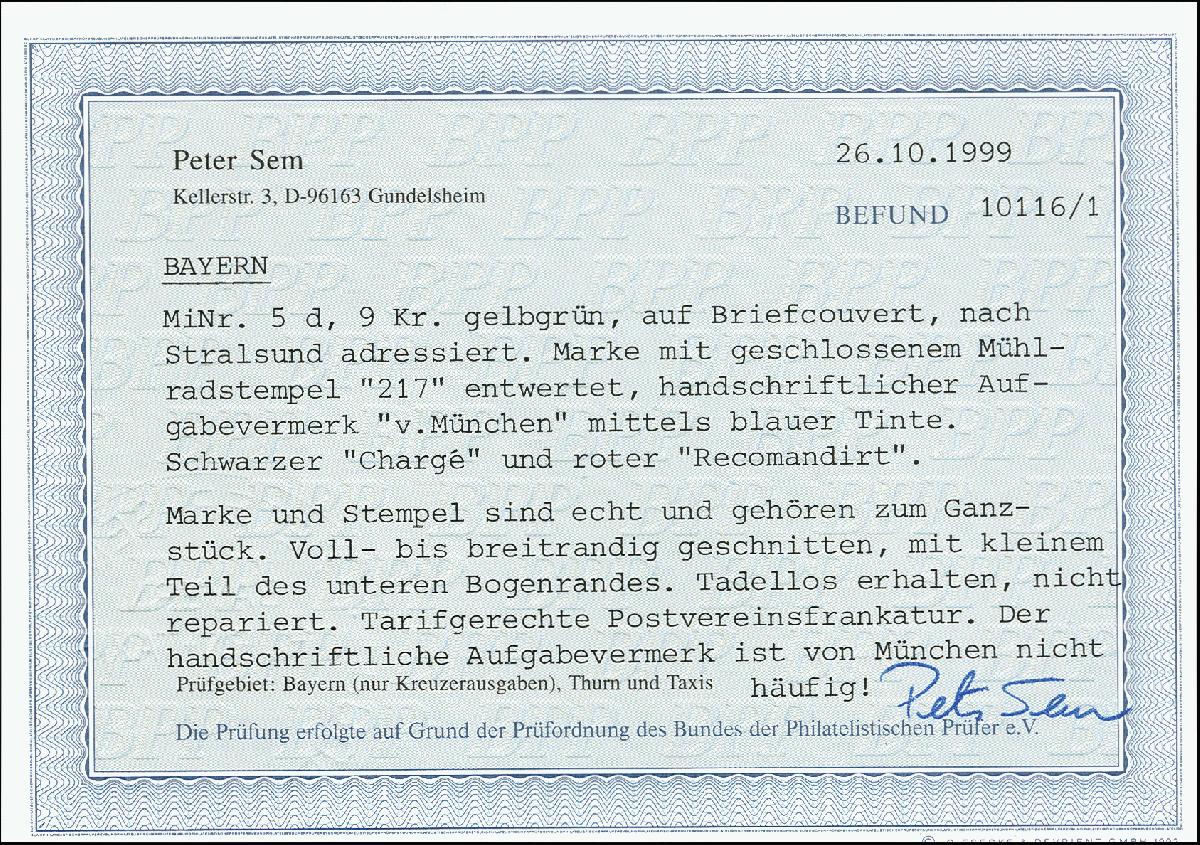 | Zusatzinformationen und Suchstichworte: | 371. Auktion Heinrich Köhler 24.-28. September 2019 Los 2551 9 Kr. gelbgrün, farbfrisch und allseits breitrandig, unten mit schmalem Bogenrand, mit zentrischem gMR "217" und alleinigem handschriftlichem Aufgabevermerk "v. München" auf Chargé-Briefhülle nach Stralsund. Ein attraktiver und in dieser Form ungewöhnlicher Brief ohne Aufgabestempel. Fotobefund Sem BPP Zuschlag 180,00 EUR |