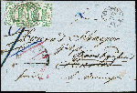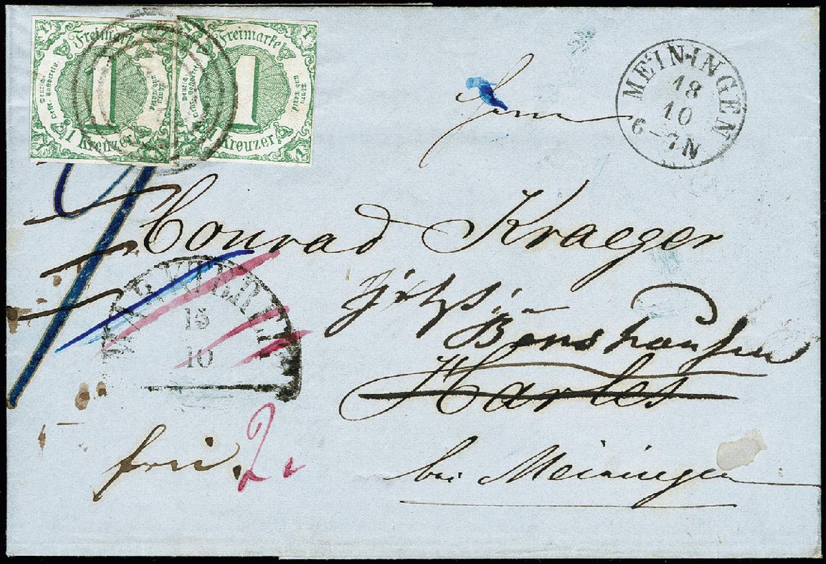 | Zusatzinformationen und Suchstichworte: | 371. Auktion Heinrich Köhler 24.-28. September 2019 Los 2553 1862, Kpl. Faltbrief mit Halbkreis "MARKTBREIT 15/10" als Portobrief mit taxierten "9" Kr. nach Harles bei Meiningen im Gebiet von Thurn und Taxis, hier umadressiert nach Benshausen in Preußen, frankiert mit 2 Stück 1859, 1 Kr. grün (reduziertes Porto im Grenzbereich) mit Nr. "258" und nebengesetztem EKr. "MEININGEN 18 10"; das vom Empfänger einzuziehende Gesamtporto von "11x" rückseitig notiert. Ein in dieser Form ganz ungewöhnlicher und außerordentlich seltener Brief mit in dieser Form wahrscheinlich einmaligen Teilfrankatur. Fotoattest Sem BPP (2013) Ausruf 4.000,00 EUR |