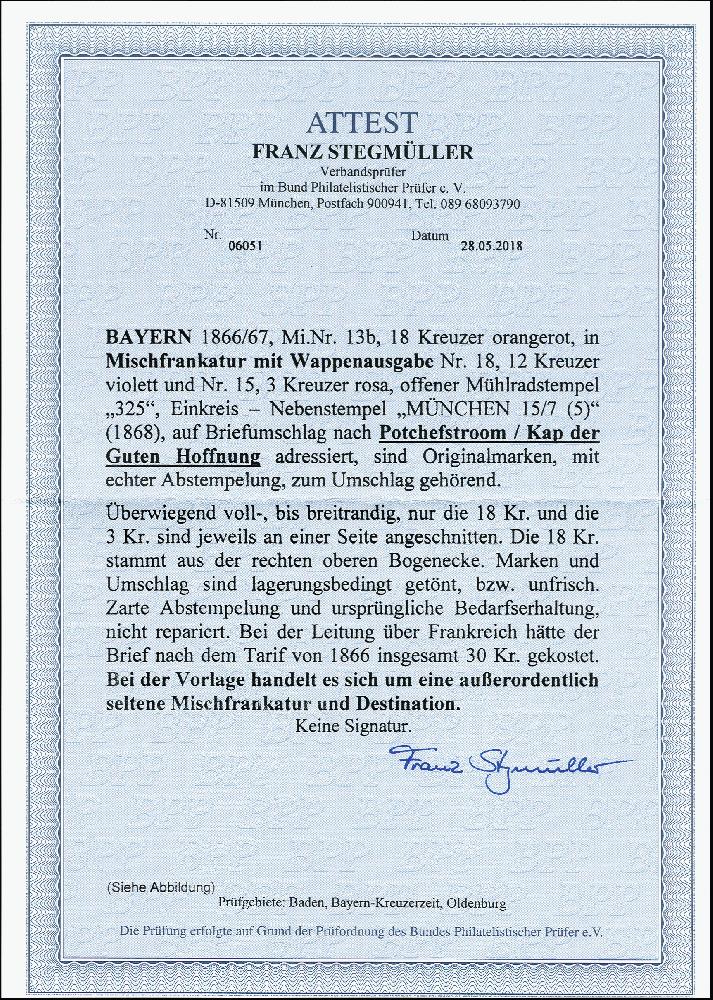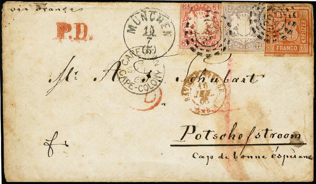 | Zusatzinformationen und Suchstichworte: | 371. Auktion Heinrich Köhler 24.-28. September 2019 Los 2564 1866/67, 18 Kr. orangerot in Mischfrankatur mit Wappenausgabe 12 Kr. violett und 3 Kr. rosa, die 12 Kr. voll- bis breitrandig, die beiden anderen teils berührt, die 18 Kr. aus der rechten oberen Bogenecke stammend, mit oMR "325" und nebengesetztem EKr. "MÜNCHEN 15/7" (1868) und Kapstadt nach Potchefstroom in der Burenrepublik Transvaal mit rückseitigem Ankunftsstempel vom 16. September. Kuvert und Frankatur etwas fleckig und das Kuvert rechts unten durch Öffnung etwas eingerissen. Der Brief ist frankiert für den Transport über England, jedoch - wie im Leitvermerk angegeben - über Frankreich befördert, hierfür um 3 Kr. überfrankiert. Briefe der Kreuzerzeit nach Südafrika sind außerordentlich selten; nach Transvaal haben wir keinen weiteren registriert; Fotoattest Stegmüller BPP (2018) Zuschlag 2.400,00 EUR |