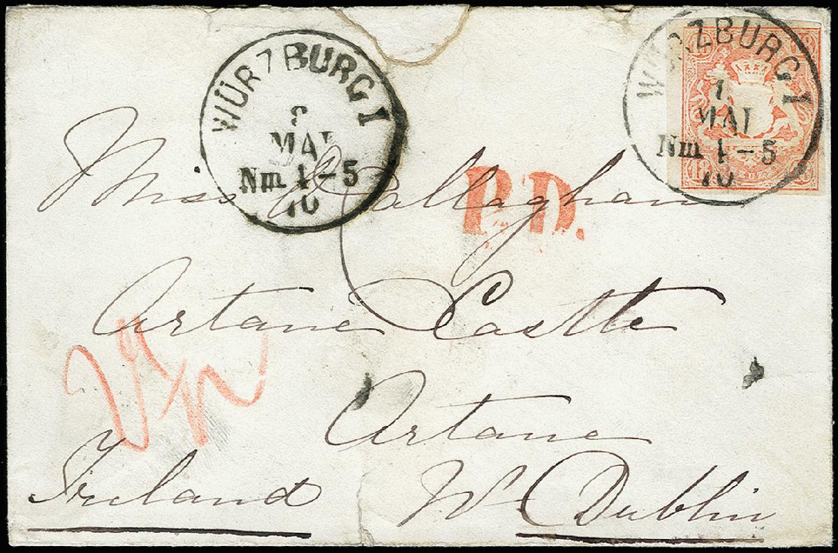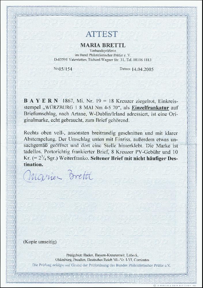| Zusatzinformationen und Suchstichworte: | 371. Auktion Heinrich Köhler 24.-28. September 2019 Los 2566 18 kr. zinnoberrot,voll- bis breitrandig, mit EKr. "WÜRZBURG 8 MAI 70" nach Dublin, Irland; der Umschlag kleiner Einriß unten und etwas unsachgemäß geöffnet, sonst einwandfrei. Eine seltene Destination; Fotoattest Brettl BPP (2005) Zuschlag 1.400,00 EUR |