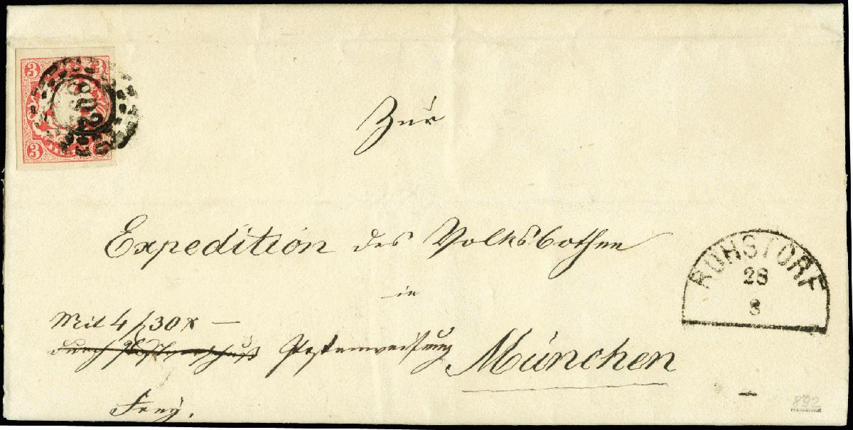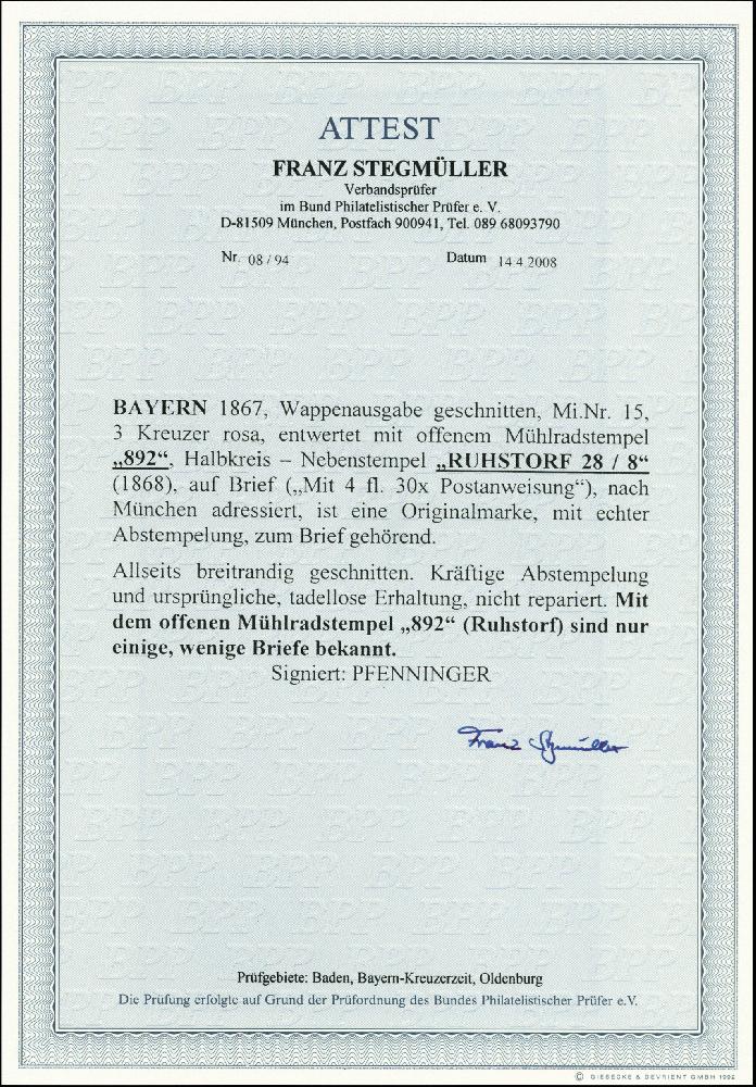 | Zusatzinformationen und Suchstichworte: | 371. Auktion Heinrich Köhler 24.-28. September 2019 Los 2572 "892" RUHSTORF, auf Wappen 3 Kr. rosa, allseits breitrandig auf kpl. Faltbrief mit sauber nebengesetztem Halbkreisstempel nach München; sehr selten, sign. Pfenninger und Fotoattest Stegmüller BPP Ausruf 1.000,00 EUR |