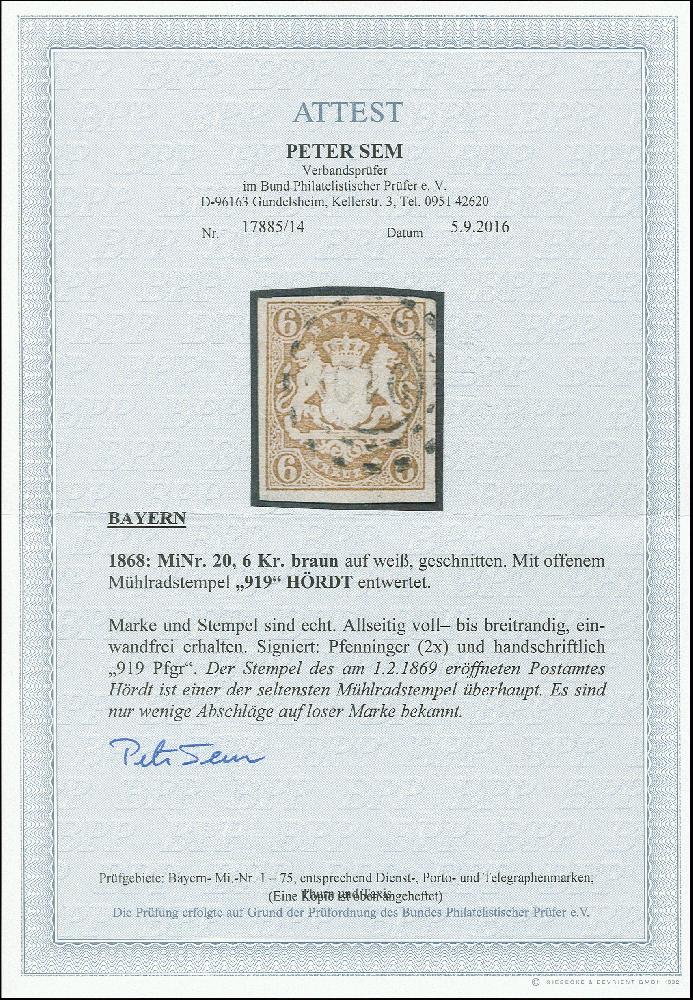 | Zusatzinformationen und Suchstichworte: | 371. Auktion Heinrich Köhler 24.-28. September 2019 Los 2574 "919" HÖRDT, leicht aber sauber und fast komplett auf Wappen 6 Kr. braun, voll- bis breitrandig; der Stempel des am 1.2.1869 eröffneten Postamtes ist einer der seltensten Mühlradstempel überhaupt; es sind nur wenige Abschläge auf loser Marke bekannt, Fotoattest Sem BPP (2016) Ausruf 2.000,00 EUR |
