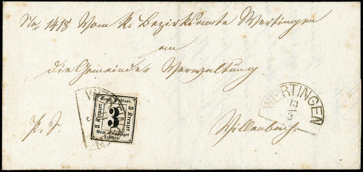 | Zusatzinformationen und Suchstichworte: | 371. Auktion Heinrich Köhler 24.-28. September 2019 Los 2578A 1862, 3 Kr. schwarz, voll- bis breitrandig mit sauber auf- und nebengesetztem Halbkreis "WERTINGEN 13/3" (1870) auf Faltbrief nach Willenbach im Nahbereich, minimal getönt, sonst tadellos, Fotoattest Brettl BPP (1999) Ausruf 300,00 EUR |