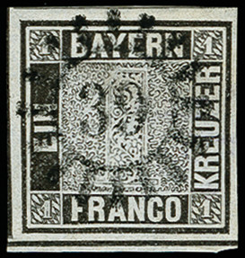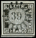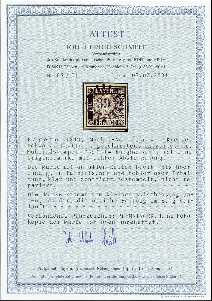 | Zusatzinformationen und Suchstichworte: | 371. Auktion Heinrich Köhler 24.-28. September 2019 Los 8003 1 Kreuzer schwarz, Platte 1, farbfrisch und voll- bis breitrandig mit Zwischenlinien an 3 Seiten, vom kleinen Zwischensteg stammend (hier übliche leichte Faltspur), sauber entwertet durch zentrischen gMR "39" BURGHAUSEN. Ein sehr schönes Stück, signiert Pfenninger und Fotoattest Schmitt BPP Zuschlag 1.500,00 EUR |