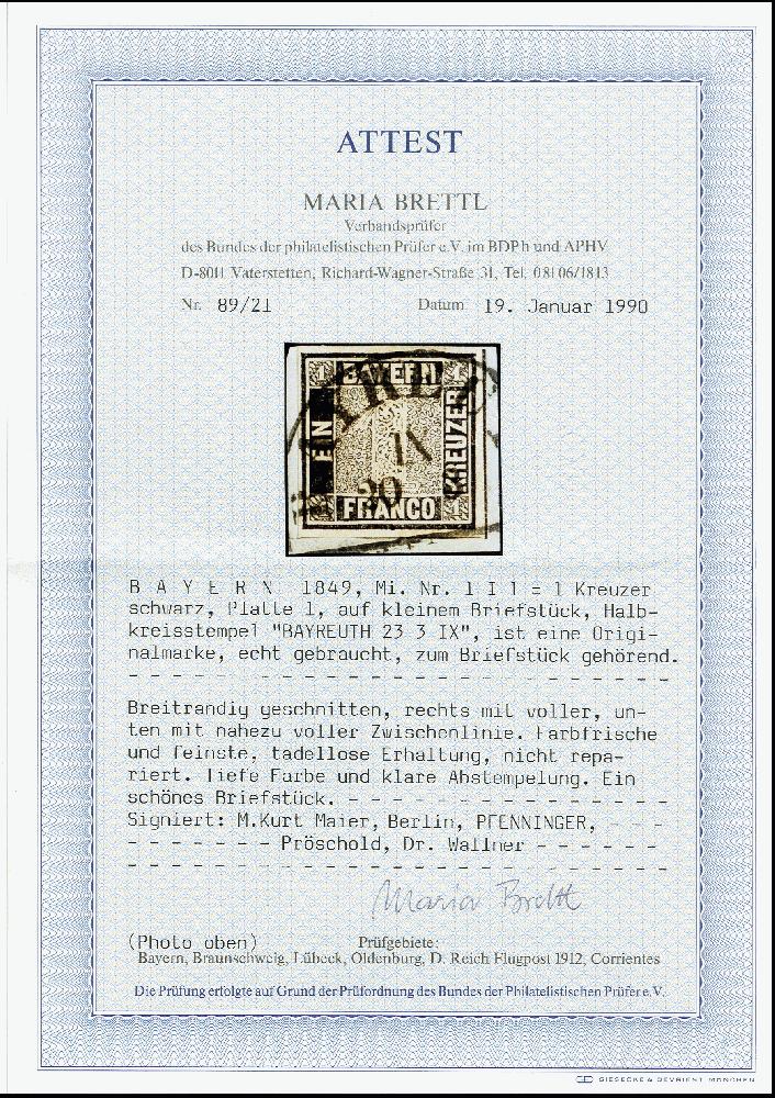 | Zusatzinformationen und Suchstichworte: | 371. Auktion Heinrich Köhler 24.-28. September 2019 Los 8005 1 Kreuzer schwarz, Platte 1, sehr schön farbfrisch und allseits breitrandig mit klar aufgesetztem Halbkreis "BAYREUTH 20 3" auf Briefstück, Kabinett, u.a. signiert Pfenninger mit Fotoattest (1966) sowie Fotoatteste Brettl BPP (1990) und Stegmüller BPP (2007) Zuschlag 1.400,00 EUR |