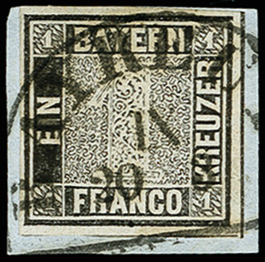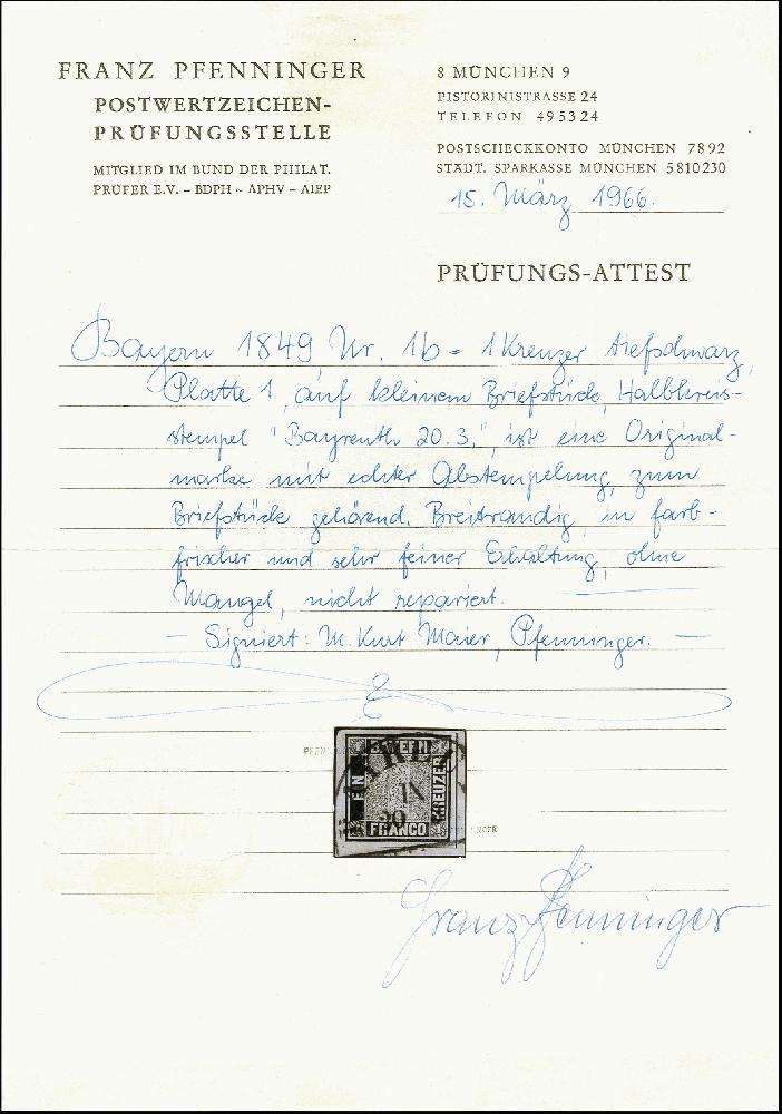 | Zusatzinformationen und Suchstichworte: | 371. Auktion Heinrich Köhler 24.-28. September 2019 Los 8005 1 Kreuzer schwarz, Platte 1, sehr schön farbfrisch und allseits breitrandig mit klar aufgesetztem Halbkreis "BAYREUTH 20 3" auf Briefstück, Kabinett, u.a. signiert Pfenninger mit Fotoattest (1966) sowie Fotoatteste Brettl BPP (1990) und Stegmüller BPP (2007) Zuschlag 1.400,00 EUR |