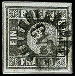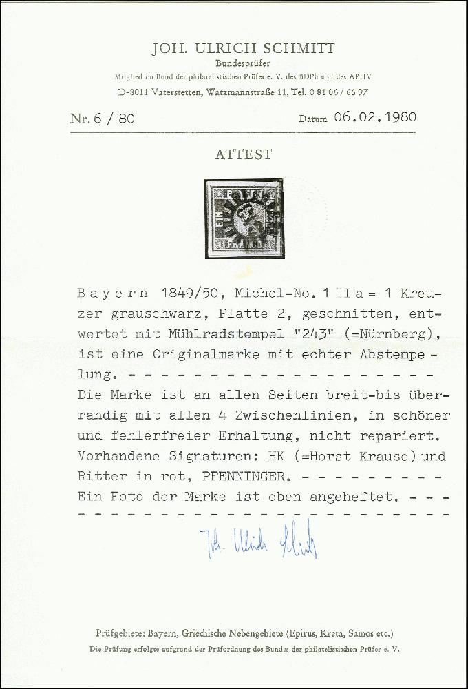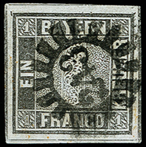 | Zusatzinformationen und Suchstichworte: | 371. Auktion Heinrich Köhler 24.-28. September 2019 Los 8010 1 Kreuzer grauschwarz, Platte 2, farbfrisch und allseits sehr breitrandig mit allen Zwischenlinien, sauber zentrisch entwertet durch gMR "243" NÜRNBERG, Kabinett, sign. HK und Pfenninger sowie Fotoattest Schmitt BPP (1980) Zuschlag 1.500,00 EUR |