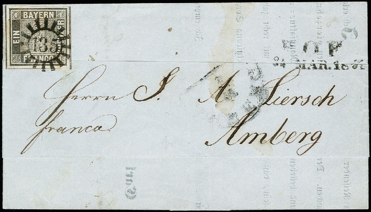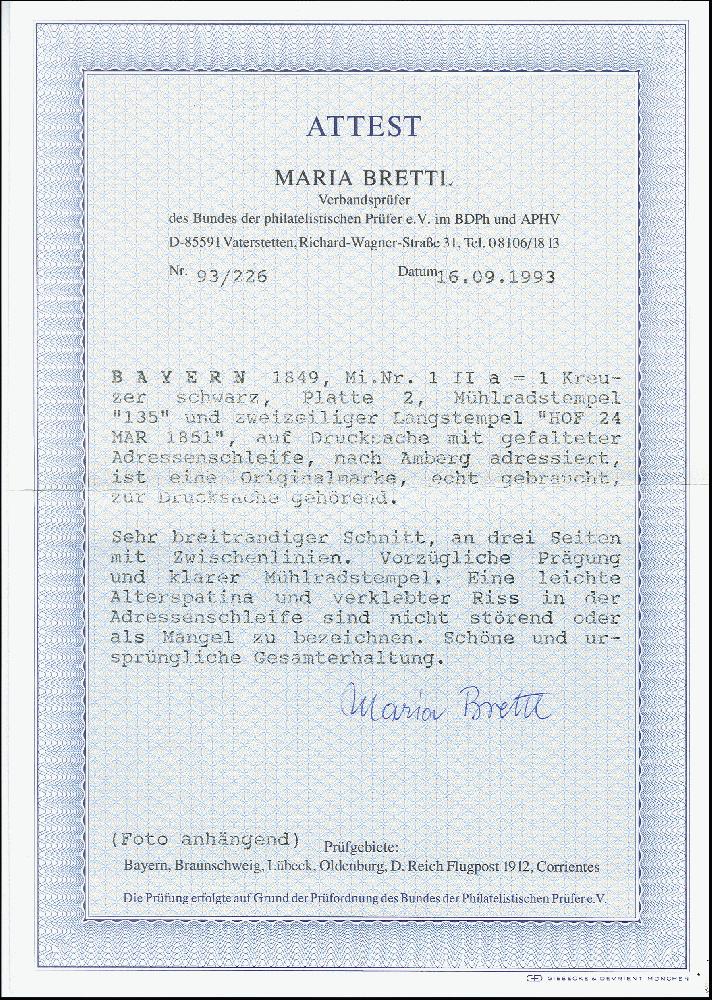 | Zusatzinformationen und Suchstichworte: | 371. Auktion Heinrich Köhler 24.-28. September 2019 Los 8013 1 Kreuzer schwarz, Platte 2, allseits breitrandig mit glasklar und gerade aufgesetztem gMR "135" auf vollständiger Streifbandsendung mit nebengesetztem L2 "HOF 24 MAR 1851" nach Amberg. Minimale Patina und außerhalb der Frankatur leicht fleckig verklebter Einriß im Briefpapier, sonst tadellose Erhaltung. Ein attraktives Stück Zuschlag 3.150,00 EUR |