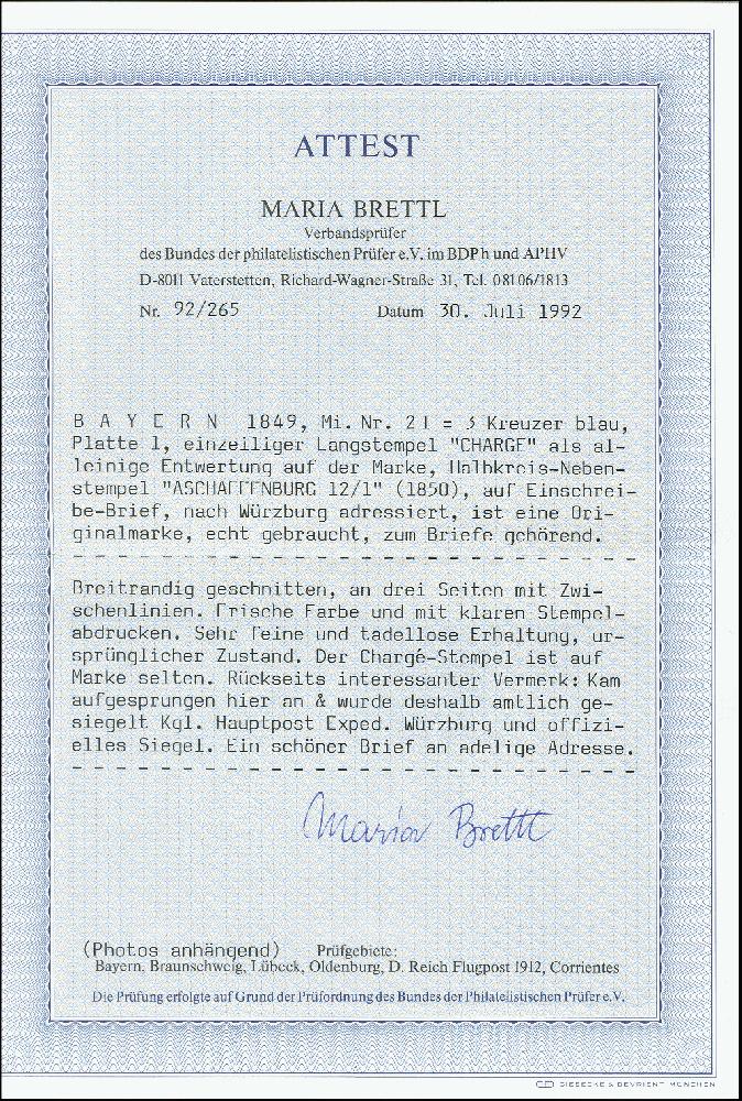 | Zusatzinformationen und Suchstichworte: | 371. Auktion Heinrich Köhler 24.-28. September 2019 Los 8028 3 Kreuzer blau, farbfrisch und allseits breitrandig mit alleiniger Entwertung durch L1 "CHARGÉ" mit klar nebengesetztem Halbkreis "ASCHAFFENBURG 12/1" auf Briefhülle mit handschriftlichem "franco gegen Schein" nach Würzburg; rückseitiger Vermerk "Kam aufgesprungen hier an & wurde deshalb amtlich gesiegelt K.gl. Hauptpost Exped. Würzburg" und nicht mehr ganz komplettem roten Lacksiegel. Ein attraktiver und in dieser Form sehr seltener Brief. Fotoattest Brettl BPP (1992) Zuschlag 2.600,00 EUR |