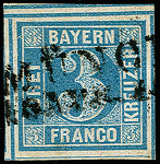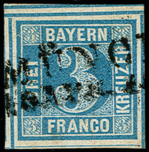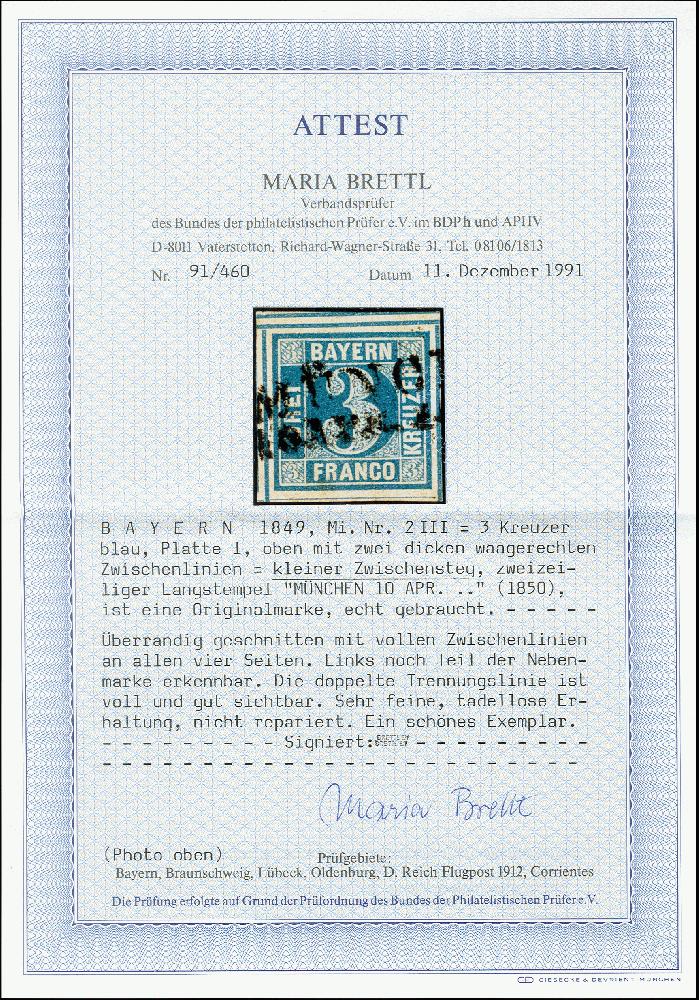 | Zusatzinformationen und Suchstichworte: | 371. Auktion Heinrich Köhler 24.-28. September 2019 Los 8030 3 Kreuzer blau, allseits breit- bis überrandig mit vollen Zwischenlinien an allen Seiten, oben mit doppelter Trennungslinie und links mit kleinem Teil der Nachbarmarke, sauber entwertet durch L2 "MÜNCHEN 10 APR. ..". Ein besonders schönes Stück mit 'kleinem Zwischensteg', signiert Brettl BPP mit Fotoattest (1991) Ausruf 300,00 EUR |