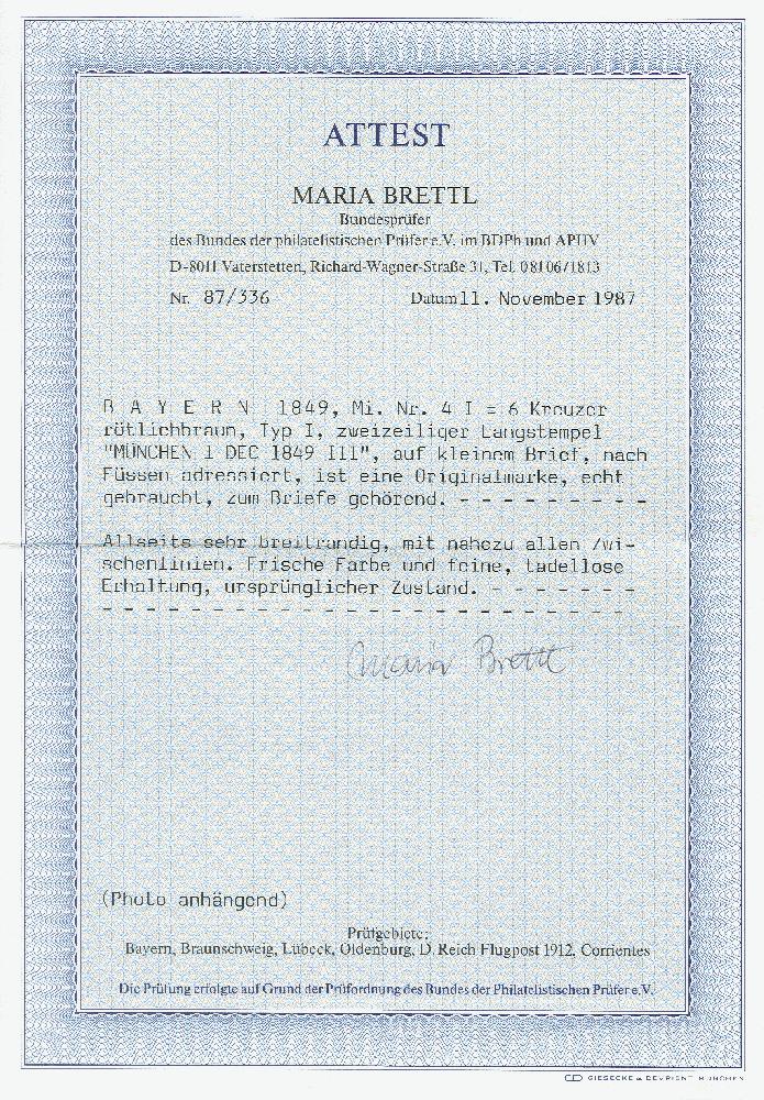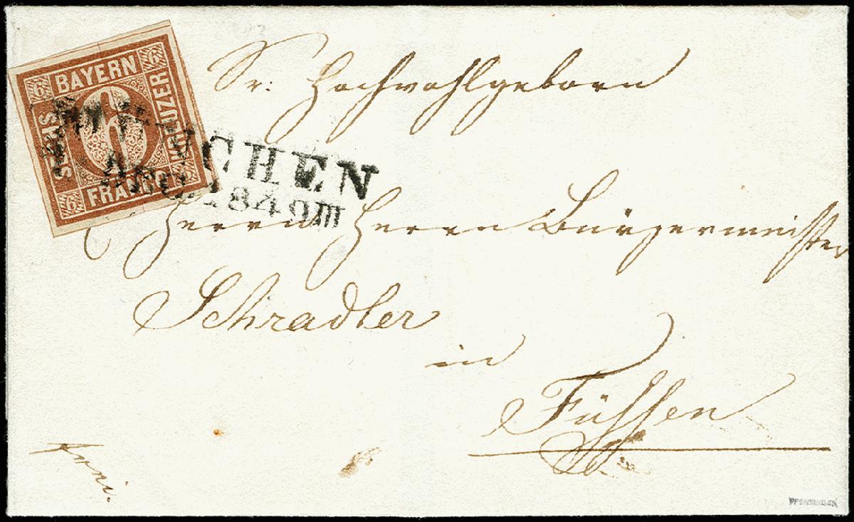 | Zusatzinformationen und Suchstichworte: | 371. Auktion Heinrich Köhler 24.-28. September 2019 Los 8044 6 Kreuzer braunorange, allseits breitrandig mit Zwischenlinien an allen Seiten, mit L2 "MÜNCHEN 1 DEC. 1849" auf kleiner Briefhülle nach Füssen, Kabinett, signiert Pfenninger und Fotoattest Brettl BPP (1987) Zuschlag 200,00 EUR |
