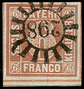 | Zusatzinformationen und Suchstichworte: | 371. Auktion Heinrich Köhler 24.-28. September 2019 Los 8047 6 Kreuzer braunorange, voll- bis meist breitrandig, rechts und links mit Zwischenlinie, unten mit doppelter Trennungslinie, sauber entwertet durch gMR "298" ROTHENBURG, Kabinett, signiert Brettl BPP mit Befund Zuschlag 260,00 EUR |