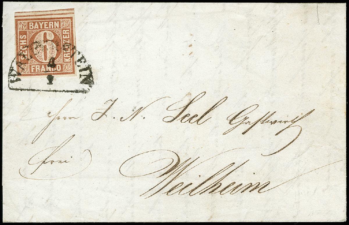 | Zusatzinformationen und Suchstichworte: | 371. Auktion Heinrich Köhler 24.-28. September 2019 Los 8048 6 Kreuzer braunorange, voll- bis breitrandig, oben mit praktisch vollständiger doppelter Trennungslinie (sogenannte 'kleine Brücke') mit sauber aufgesetztem Halbkreis "WALLERSTEIN 4/2" auf Faltbrief (linke Seitenklappe fehlend und rechte verkürzt) nach Weilheim. Marken mit doppelter Trennungslinie sind auf Brief sehr selten. Ein schöner Brief in sonst einwandfreier Erhaltung. Fotoattest Brettl BPP (1994) Ausruf 800,00 EUR |