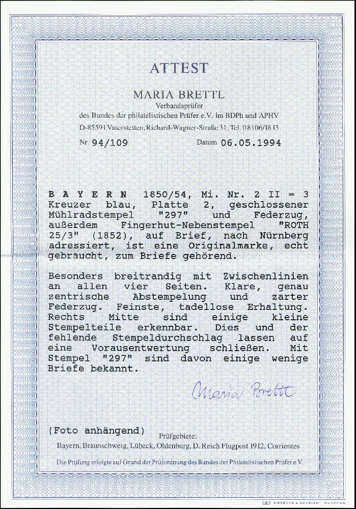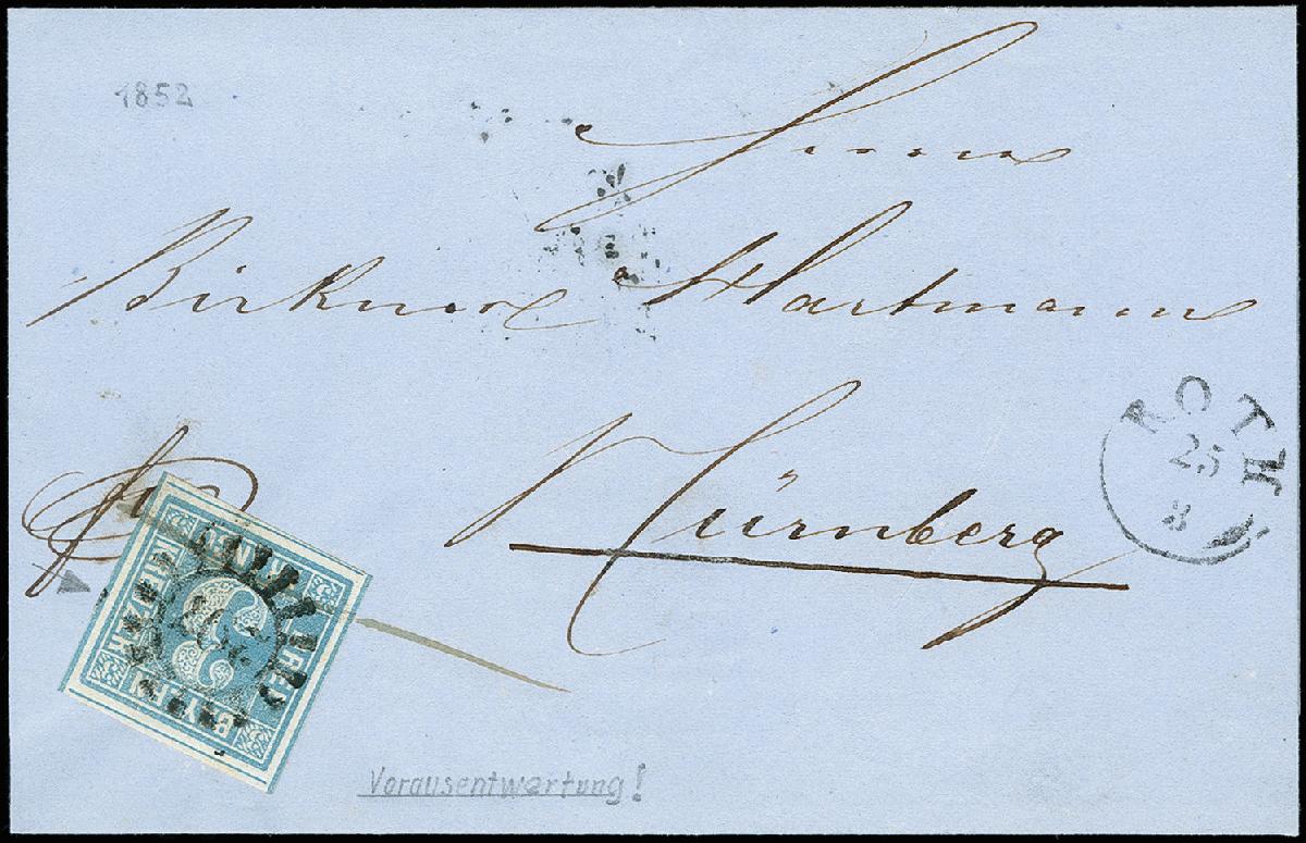 | Zusatzinformationen und Suchstichworte: | 371. Auktion Heinrich Köhler 24.-28. September 2019 Los 8052 3 Kreuzer blau, Platte 2, allseits breitrandig mit Vorausentwertung durch gMR "297" (zusätzlich kleiner Stempelteil rechts im Rand) und Federzug auf Briefhülle mit nebengesetztem Fingerhutstempel "ROTH 25 3" (1852) nach Nürnberg mit Ankunftsstempel. Ein attraktives Stück in guter Erhaltung, Fotoattest Brettl BPP (1994) Ausruf 300,00 EUR |