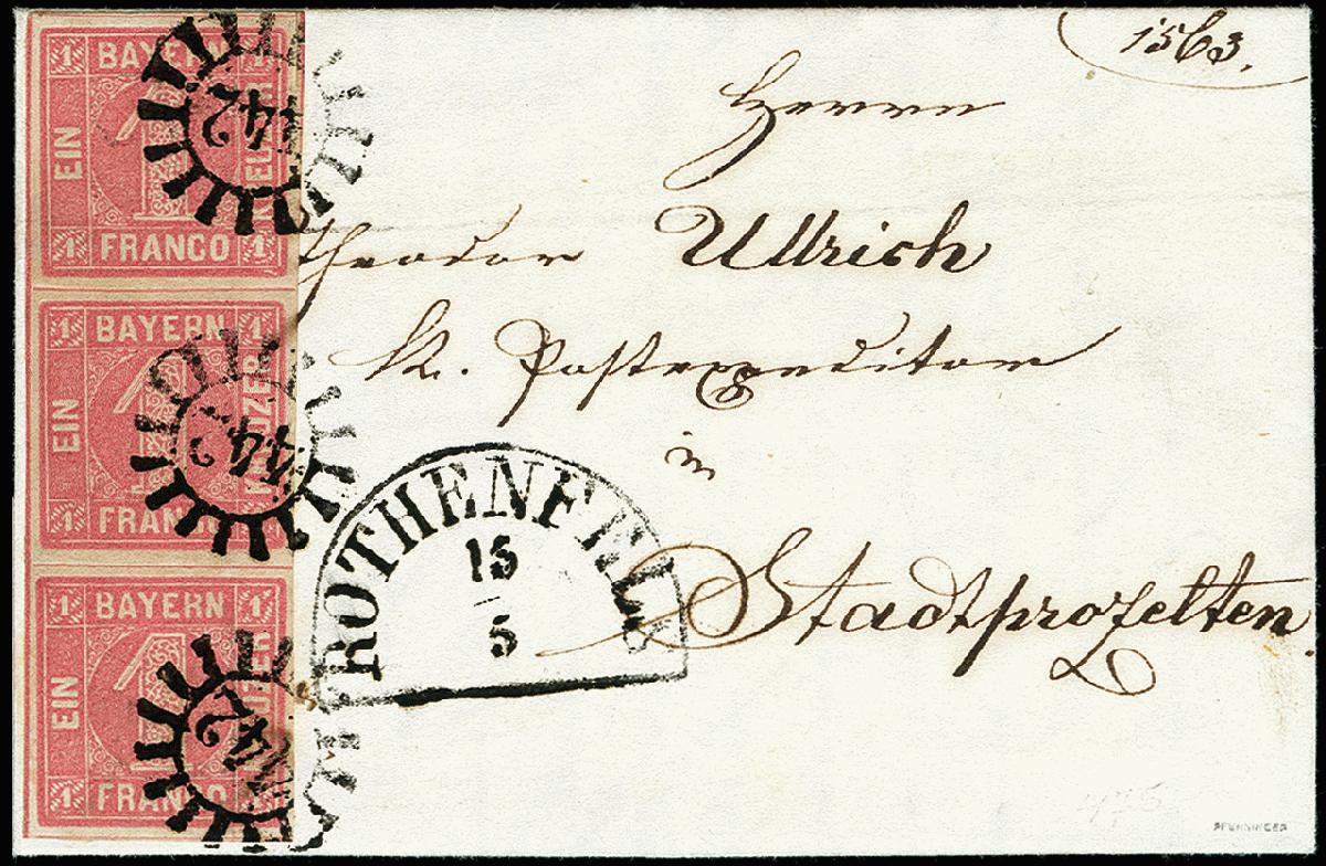 | Zusatzinformationen und Suchstichworte: | 371. Auktion Heinrich Köhler 24.-28. September 2019 Los 8062 1 Kreuzer rosa im senkrechten 3er-Streifen, sehr schöne tiefe frische Farbe und allseits breitrandig mit jeweils sauber aufgesetztem gMR "442" und nebengesetztem Halbkreis "ROTHENFELS 15/5" auf kleinem Faltbrief nach Stadtprozelten, Kabinett, signiert Pfenninger und Kurzbefund Stegmüller BPP Zuschlag 280,00 EUR |