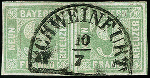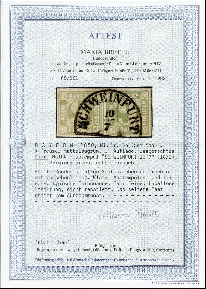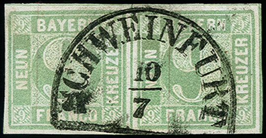| Zusatzinformationen und Suchstichworte: | 371. Auktion Heinrich Köhler 24.-28. September 2019 Los 8078 9 Kreuzer mattblaugrün im waagerechten Paar, voll- bis meist breitrandig, oben und rechts mit Zwischenlinien, sehr schön entwertet durch zentrischen Halbkreis "SCHWEINFURT 10/7" (1850). Ein sehr schönes Paar mit seltener Entwertung aus den ersten Tagen nach Ausgabe. Fotoattest Brettl BPP (1988) Zuschlag 500,00 EUR |