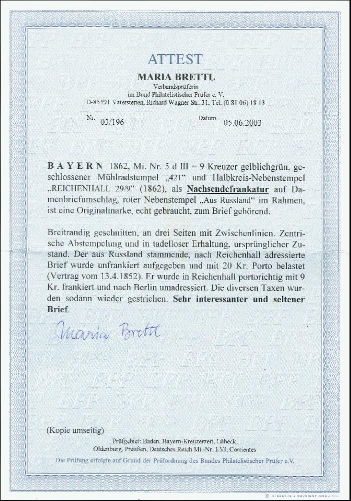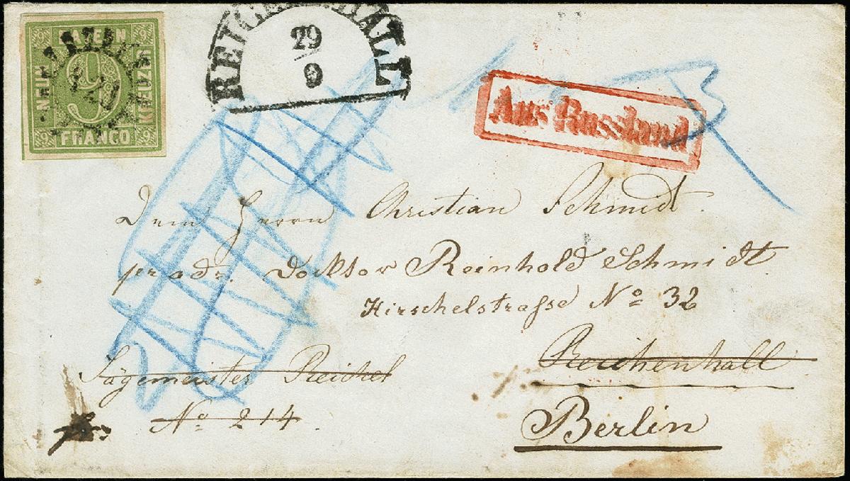 | Zusatzinformationen und Suchstichworte: | 371. Auktion Heinrich Köhler 24.-28. September 2019 Los 8083 9 Kreuzer gelblichgrün, allseits breitrandig mit zentrischem gMR "421" und nebengesetztem Halbkreis "RECHENHALL 29/9" als Nachsendefrankatur auf Briefkuvert von "RIGA 12 SEP 1862" mit vorderseitigem roten Rahmenstempel "Aus Russland" nach Reichenhall, hier als unfrankierter Brief taxiert mit "20" Kreuzern (bei erneuter Aufgabe gestrichen). Minimale inhaltsbedingte Druckspur, sonst einwandfrei. Ein interessanter und seltener Brief. Fotoattest Brettl BPP (2003) Zuschlag 2.800,00 EUR |
