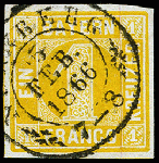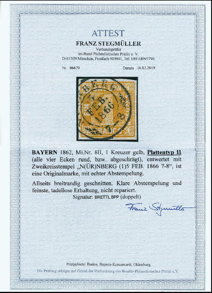 | Zusatzinformationen und Suchstichworte: | 371. Auktion Heinrich Köhler 24.-28. September 2019 Los 8097 1 Kreuzer gelb, Type II, farbfrisch und allseits breitrandig mit fast zentrisch klar aufgesetztem DKr. "NÜRNBERG 15 FEB. 1866"; feinste und tadellose Erhaltung. Ein besonders schönes Stück dieser seltenen und schwierigen Marke; signiert Brettl BPP und Fotoattest Stegmüller BPP (2019) Zuschlag 1.500,00 EUR |