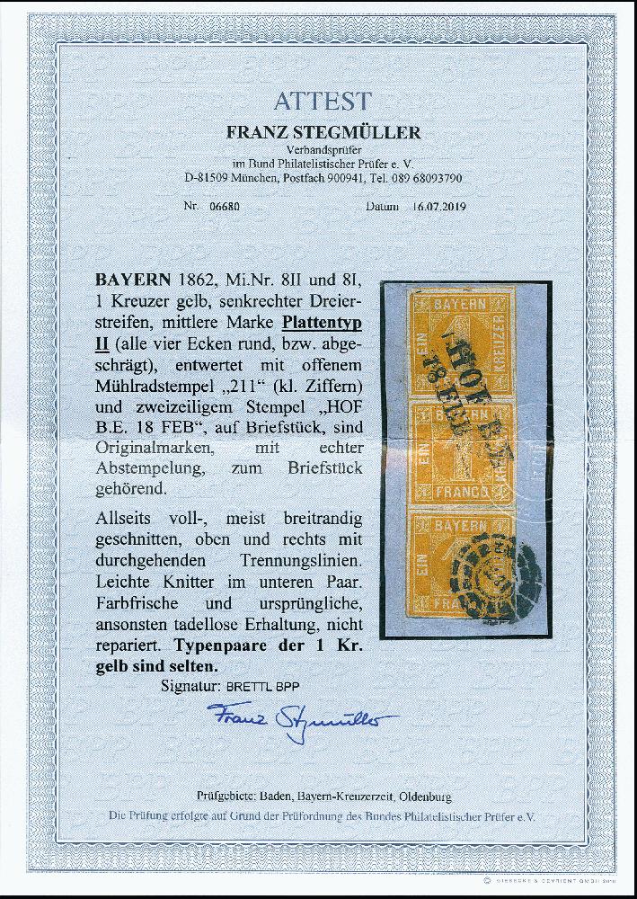 | Zusatzinformationen und Suchstichworte: | 371. Auktion Heinrich Köhler 24.-28. September 2019 Los 8098 1 Kreuzer gelb im senkrechten 3er-Streifen, dabei die mittlere Marke in Type II, die beiden anderen in Type I, allseits voll- bis meist breitrandig und sehr schön farbfrisch, mit attraktiver Duplex-Entwertung oMR "211" mit kleinen Ziffern bzw. L2 "HOF B.E. 18 FEB." auf Briefstück. Das untere Paar mit minimalen Knittern, sonst tadellos. Ein attraktiver und in dieser Form ungemein seltener Streifen. Signiert Brettl BPP und Fotoattest Stegmüller BPP (2019) Zuschlag 800,00 EUR |