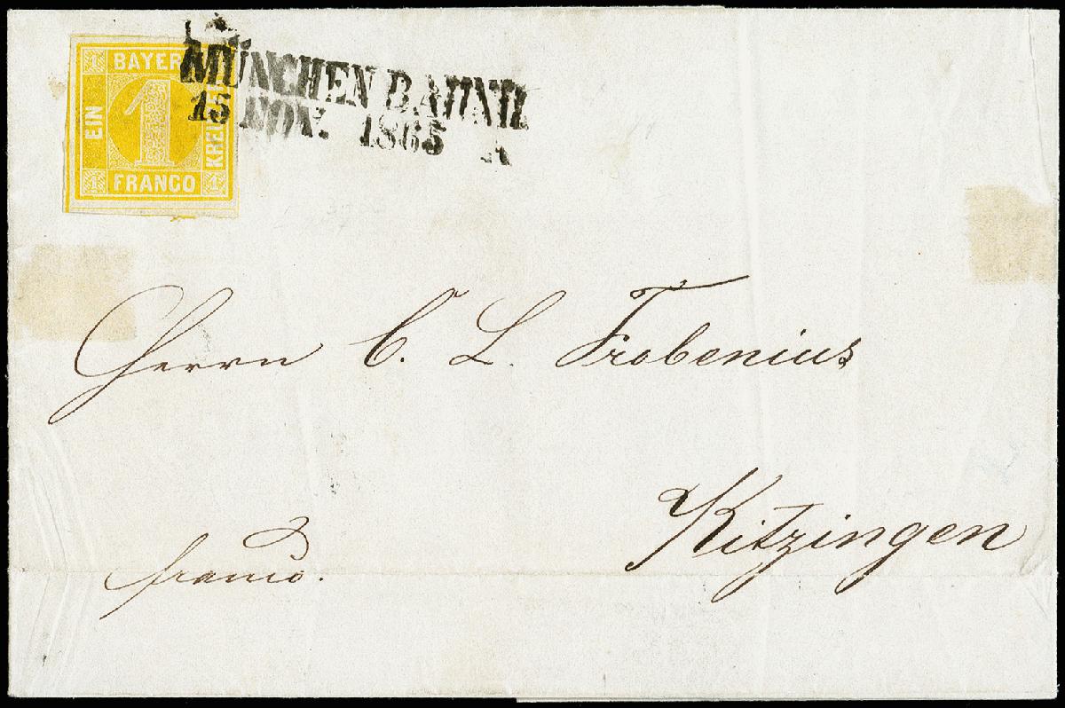 | Zusatzinformationen und Suchstichworte: | 371. Auktion Heinrich Köhler 24.-28. September 2019 Los 8099 1 Kreuzer gelb, Type II, voll- bis breitrandig mit L2 "MÜNCHEN BAHNH. 15 NOV. 1865" auf Drucksachenhülle nach Kitzingen. Der Seidenfaden wohl vor dem Aufkleben rückseitig ausgefallen, die Hülle mit leichten Schürfungen bzw. Klebefilmspuren, dennoch durchaus attraktive und sehr seltene Frankatur. Signiert Schmitt BPP mit Befund (1976) und Fotoattest Stegmüller BPP (2019) Zuschlag 800,00 EUR |