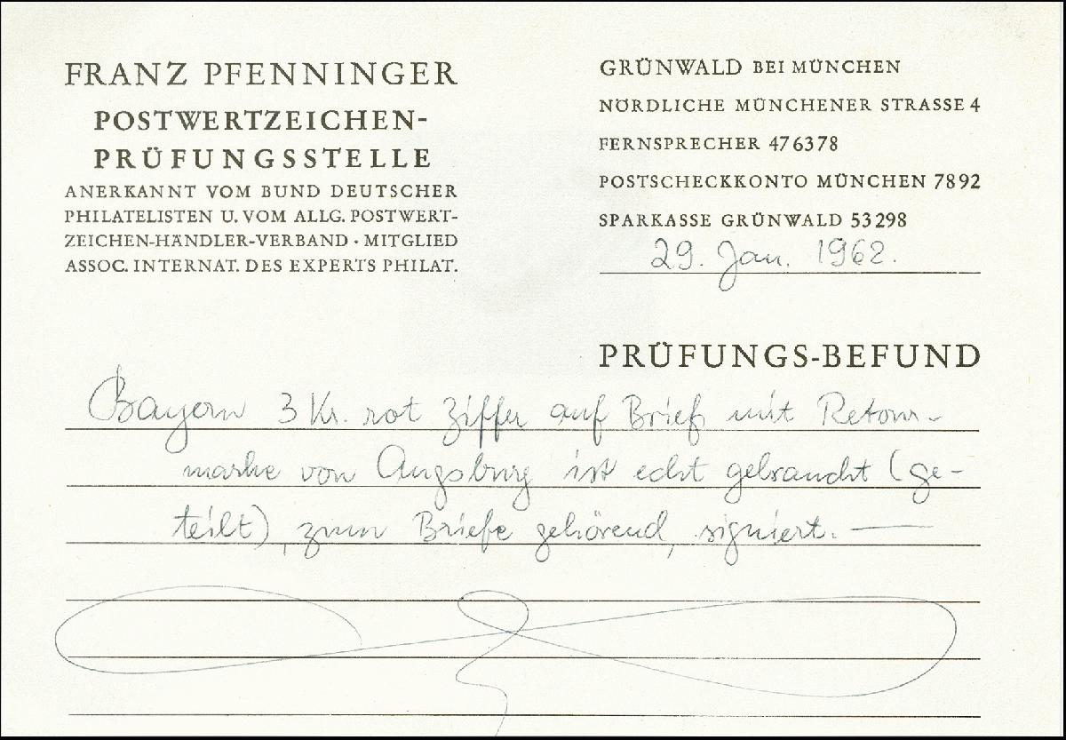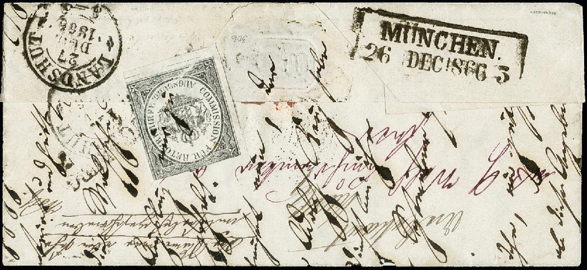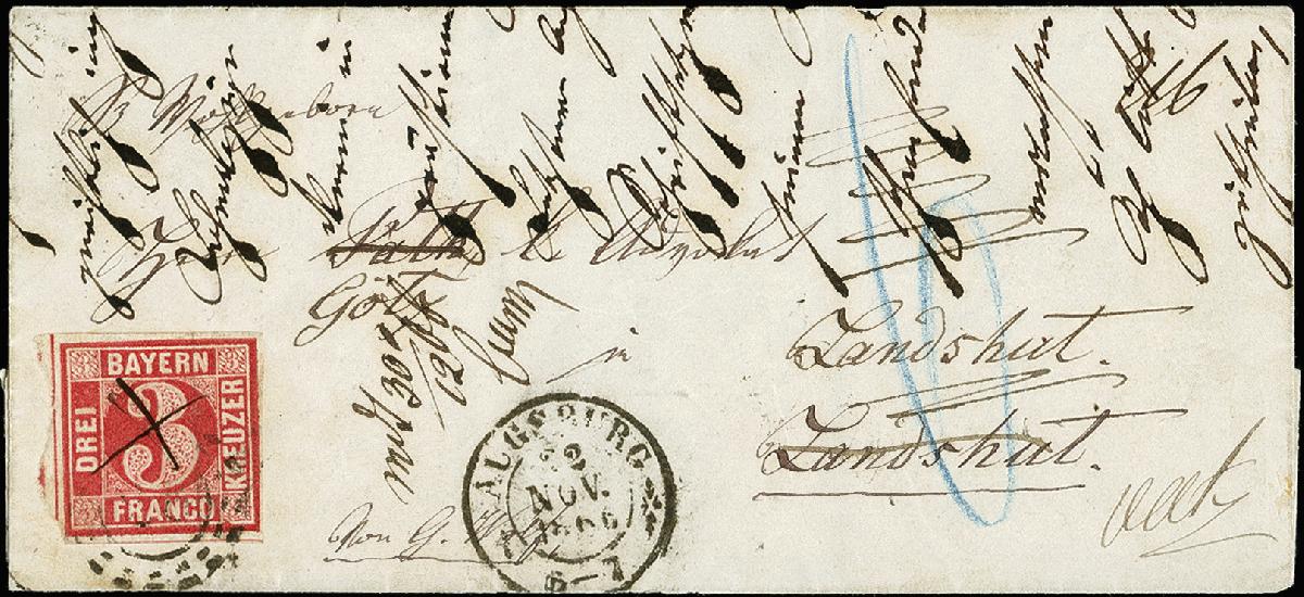 | Zusatzinformationen und Suchstichworte: | 371. Auktion Heinrich Köhler 24.-28. September 2019 Los 8100 3 Kreuzer rot, voll- bis breitrandig mit oMR "28" und nebengesetztem Doppelkreisstempel "AUGSBURG 22 NOV. 1866" auf kleiner Briefhülle an einen Advokaten in Landshut, hier jedoch nicht zustellbar und retourniert nach Augsburg. In Augsburg zur Feststellung des Absender amtlich eröffnet und verschlossen mit schwarzer Retourmarke und dem Absender zurückgegeben. Anschließend mit geänderter Namen in der Adresse jedoch ohne neuerliche Frankatur wieder nach Landshut gesandt und hier aufgrund des fehlenden Frankos mit "6" Kreuzern nachtaxiert. Teils Aktenbeschriftung auf Vorder- und Rückseite, sonst gute verwendungstypische Erhaltung. Signiert Pfenninger mit Befund. Zuschlag 260,00 EUR |