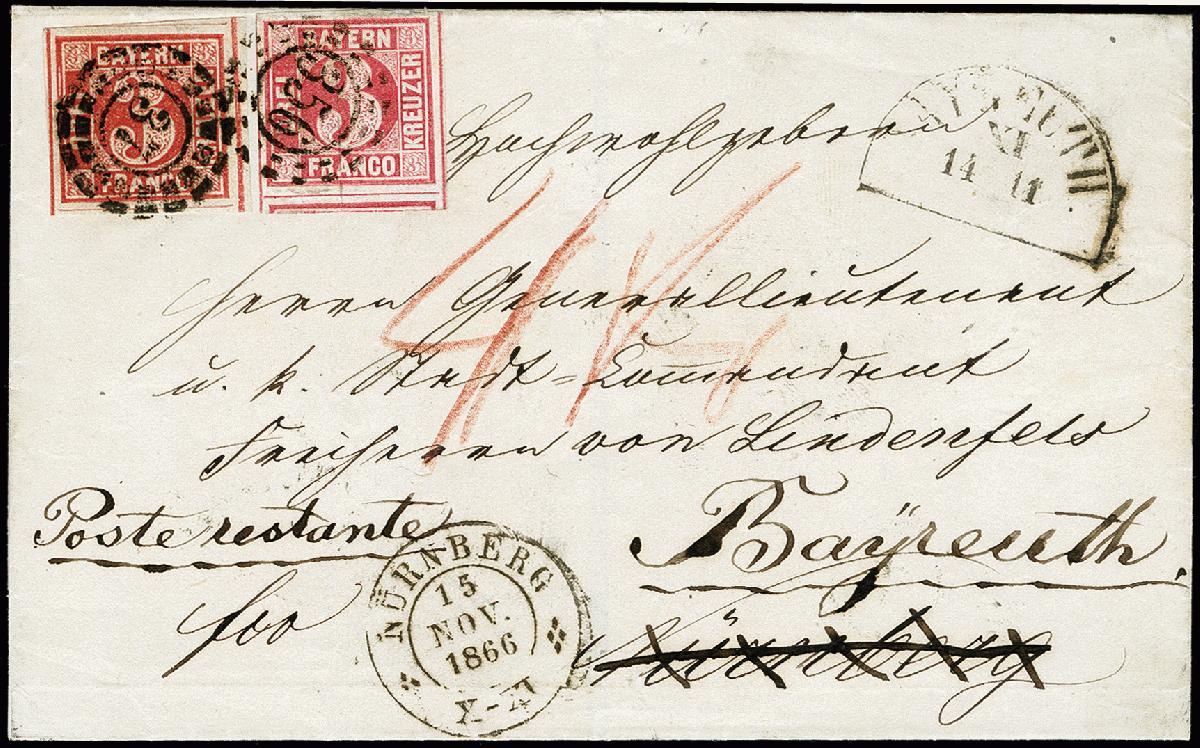 | Zusatzinformationen und Suchstichworte: | 371. Auktion Heinrich Köhler 24.-28. September 2019 Los 8102 3 Kreuzer rosa, 2 Einzelwerte, beide breit- bis überrandig mit sauberem oMR "37" bzw. "356" auf Briefhülle von "BAYREUTH 14 11" nach Nürnberg 'Poste restante' und nach- bzw. zurückgesandt von "NÜRNBERG 15 NOV. 1866" nach Bayreuth. Eine Rötelnotiz "4 fach" ist laut Fotoattest Brettl BPP nicht klärbar. Ein attraktiver und in dieser Form seltener Brief in sehr schöner Erhaltung Zuschlag 650,00 EUR |