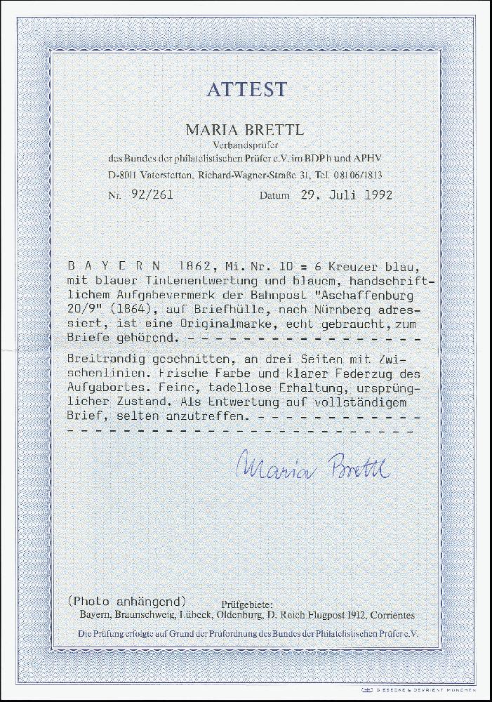 | Zusatzinformationen und Suchstichworte: | 371. Auktion Heinrich Köhler 24.-28. September 2019 Los 8109 6 Kreuzer blau, voll- bis breitrandig mit handschriftlicher Entwertung und nebengesetztem handschriftlichen Aufgabevermerk "ASCHAFFENBG. 20/9" auf Briefhülle nach Nürnberg mit Ankunftsstempel vom nächsten Tag, Pracht, Fotoattest Brettl BPP (1992) Zuschlag 120,00 EUR |