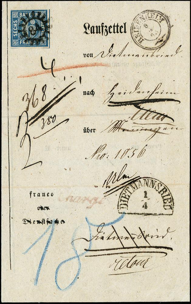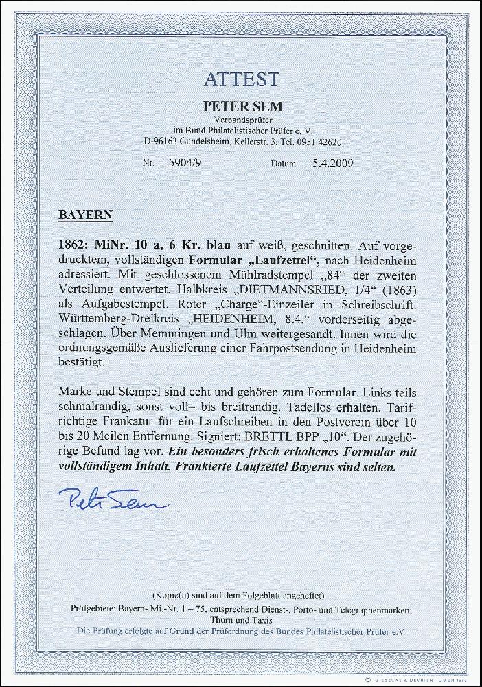| Zusatzinformationen und Suchstichworte: | 371. Auktion Heinrich Köhler 24.-28. September 2019 Los 8110 6 Kreuzer blau, links teils schmal, sonst voll- bis breitrandig und farbfrisch mit sauber aufgesetztem gMR "84" auf Chargé-Laufzettel mit sauber aufgesetztem Halbkreis "DIETMANNSRIED 1/4" (1863) nach Heidenheim in Württemberg über Memmingen und Ulm. Ein seltenes und attraktives Formular, signiert Brettl BPP und Fotoattest Sem BPP (2009) Zuschlag 1.900,00 EUR |
