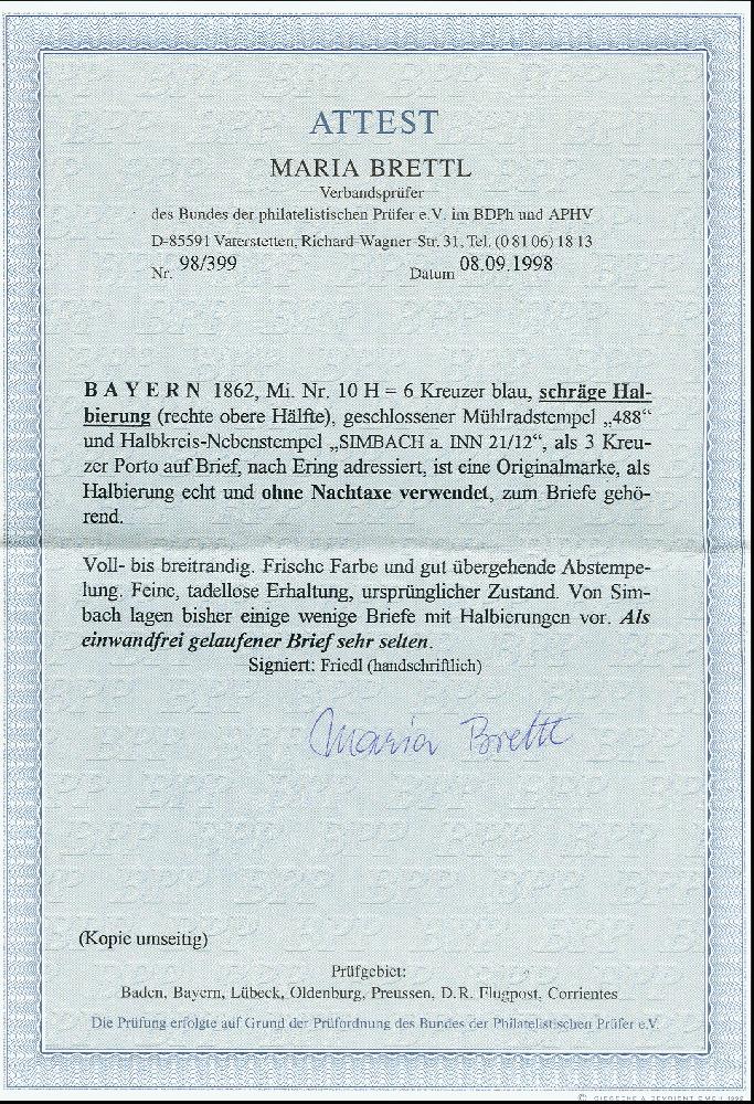| Zusatzinformationen und Suchstichworte: | 371. Auktion Heinrich Köhler 24.-28. September 2019 Los 8112 6 Kreuzer blau, diagonal halbiert, rechte obere Hälfte, voll- bis breitrandig und farbfrisch mit gMR "488" und nebengesetztem Halbkreis "SIMBACH a. INN 21/12" auf Briefhülle nach Ering unbeanstandet befördert. Eine schöne und seltene Halbierungs-Frankatur, aus Simbach haben wir nur eine weitere Halbierung dieser Marke auf Brief registriert. Signiert Friedl mit Attest (1949) sowie Fotoattest Brettl BPP (1998) Zuschlag 7.000,00 EUR |