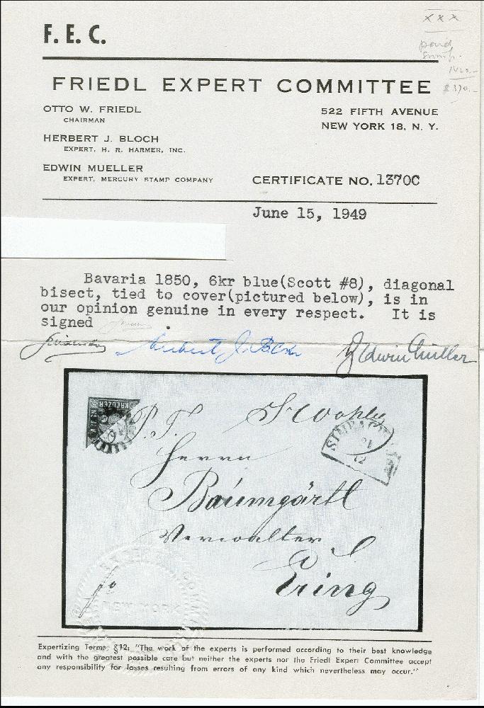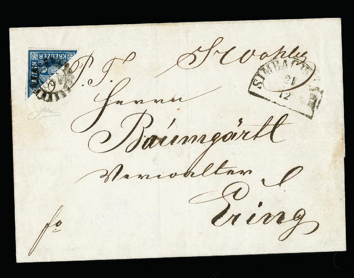 | Zusatzinformationen und Suchstichworte: | 371. Auktion Heinrich Köhler 24.-28. September 2019 Los 8112 6 Kreuzer blau, diagonal halbiert, rechte obere Hälfte, voll- bis breitrandig und farbfrisch mit gMR "488" und nebengesetztem Halbkreis "SIMBACH a. INN 21/12" auf Briefhülle nach Ering unbeanstandet befördert. Eine schöne und seltene Halbierungs-Frankatur, aus Simbach haben wir nur eine weitere Halbierung dieser Marke auf Brief registriert. Signiert Friedl mit Attest (1949) sowie Fotoattest Brettl BPP (1998) Zuschlag 7.000,00 EUR |