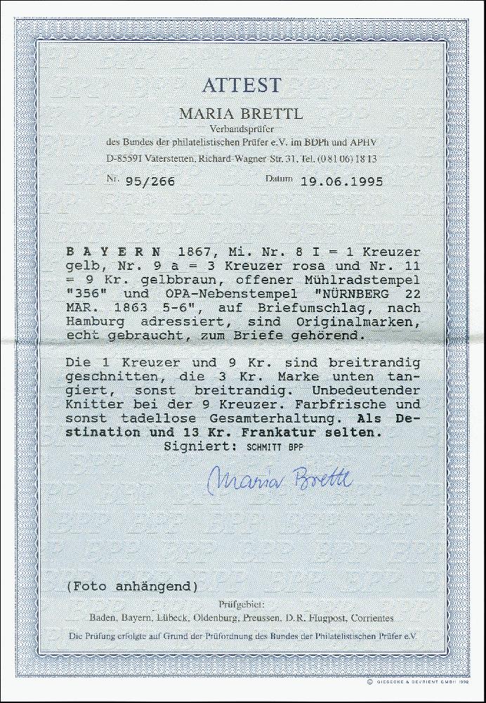 | Zusatzinformationen und Suchstichworte: | 371. Auktion Heinrich Köhler 24.-28. September 2019 Los 8118 9 Kreuzer ockerbraun, 3 Kreuzer rosa und 1 Kreuzer gelb, alle farbfrisch und voll- bis meist breitrandig, lediglich die 3 Kreuzer unten etwas angeschnitten, mit oMR "356" und nebengesetztem DKr. "NÜRNBERG 22 MAR. 1853" auf Briefkuvert an den Kaufmann Theodor Werlich in Hamburg, irrtümlich frankiert mit dem Dänemark Porto für einen Zielort in Holstein/Lauenburg. Die 9 Kreuzer unbedeutender Knitter, sonst einwandfrei. Ein interessanter Brief mit attraktiver Dreifarben-Frankatur. Signiert Schmitt BPP und Fotoattest Brett BPP (1995) Ausruf 800,00 EUR |
