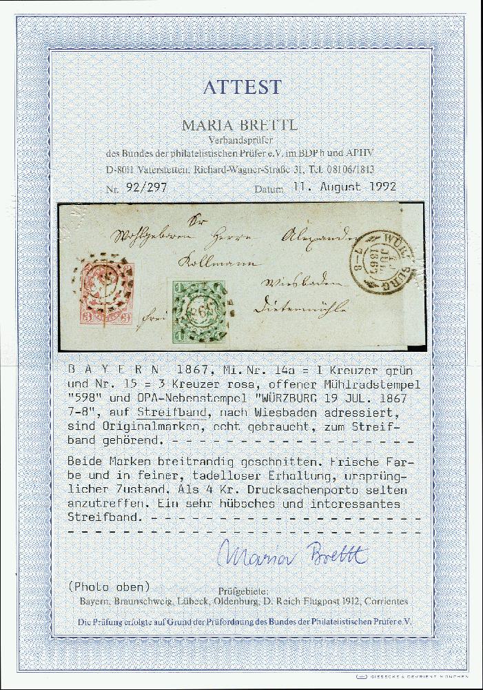 | Zusatzinformationen und Suchstichworte: | 371. Auktion Heinrich Köhler 24.-28. September 2019 Los 8127 1 Kreuzer grün und 3 Kreuzer rosa, beide farbfrisch und breitrandig mit oMR "598" und sauber nebengesetztem Doppelkreisstempel "WÜRZBURG 19 JUL. 1867" auf Streifband der 4. Gewichtsstufe (7½-10 Lot) nach Wiesbaden. Eine attraktive und seltene Drucksachen-Frankatur in einwandfreier Erhaltung. Fotoattest Brettl BPP (1992) Zuschlag 1.200,00 EUR |