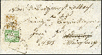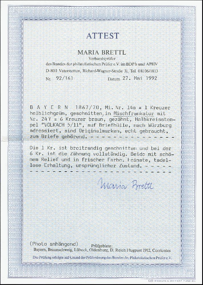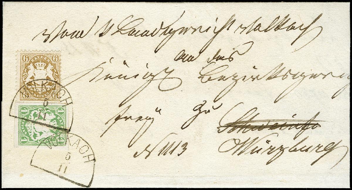 | Zusatzinformationen und Suchstichworte: | 371. Auktion Heinrich Köhler 24.-28. September 2019 Los 8129 1 Kreuzer gelblichgrün, allseits breitrandig und farbfrisch in Mischfrankatur mit gezähnter Ausgabe 6 Kreuzer ockerbraun, ebenfalls farbfrisch und einwandfrei gezähnt, mit zweimal klar aufgesetztem Halbkreis "VOLKACH 5/11" auf Briefhülle nach Würzburg; sehr schöne und tadellose Erhaltung. Fotoattest Brettl BPP (1992) Zuschlag 340,00 EUR |