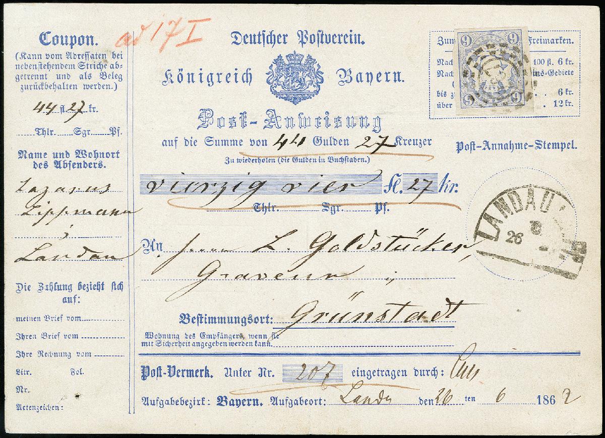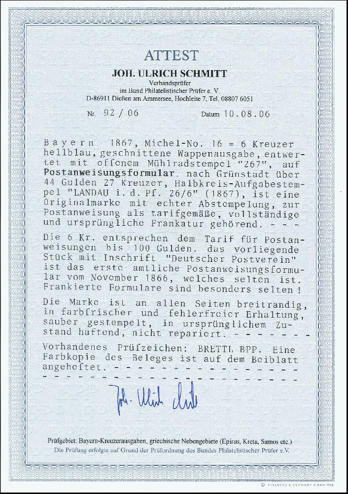| Zusatzinformationen und Suchstichworte: | 371. Auktion Heinrich Köhler 24.-28. September 2019 Los 8140 6 Kreuzer blau, farbfrisch und allseits breitrandig mit leicht und sauber übergehend aufgesetztem oMR "267" und nebengesetztem Halbkreis "LANDAU i.d. Pf. 26/6" (1867) auf vollständiger Postanweisung mit Coupon für einen Betrag von 44 Gulden und 27 Kreuzern nach Grünstadt mit rückseitigem Auszahlungsvermerk und Ankunftsstempel vom nächsten Tag. Ein äußerst attraktives Stück in sehr schöner einwandfreier ursprünglicher Erhaltung (2 übliche ganz leichte Faltspuren außerhalb der Frankatur). Frankierte Postanweisungen von Bayern sind sehr selten, mit geschnittenen Marken nur ganz wenige Stücke bekannt. Signiert Brettl BPP und Fotoattest Schmitt BPP (2006) Zuschlag 7.000,00 EUR |