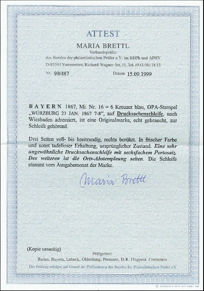 | Zusatzinformationen und Suchstichworte: | 371. Auktion Heinrich Köhler 24.-28. September 2019 Los 8141 6 Kreuzer blau, rechts berührt, bzw. leicht angeschnitten, sonst voll- bis breitrandig mit Doppelkreisstempel "WÜRZBURG 23 JAN. 1867" (Ausgabemonat) auf Streifband der 6. Gewichtsstufe nach Wiesbaden. Derartig schwere Drucksachen sind außerordentlich selten. Ein interessantes und attraktives Stück. Fotoattest Brettl BPP (1999) Zuschlag 450,00 EUR |
