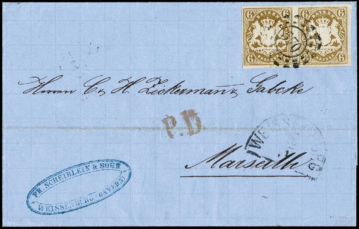 | Zusatzinformationen und Suchstichworte: | 371. Auktion Heinrich Köhler 24.-28. September 2019 Los 8145 6 Kreuzer braun im waagerechten Paar, farbfrisch und voll- bis breitrandig mit einem zentrischen oMR "570" auf Briefhülle mit nebengesetztem Halbreis "WEISSENBURG 26/1" (1869) nach Marseille; eine sehr schöne Paar-Frankatur in einwandfreier Erhaltung; signiert Pfenninger und Kruschel sowie Fotoattest Schmitt BPP (1990) Zuschlag 300,00 EUR |