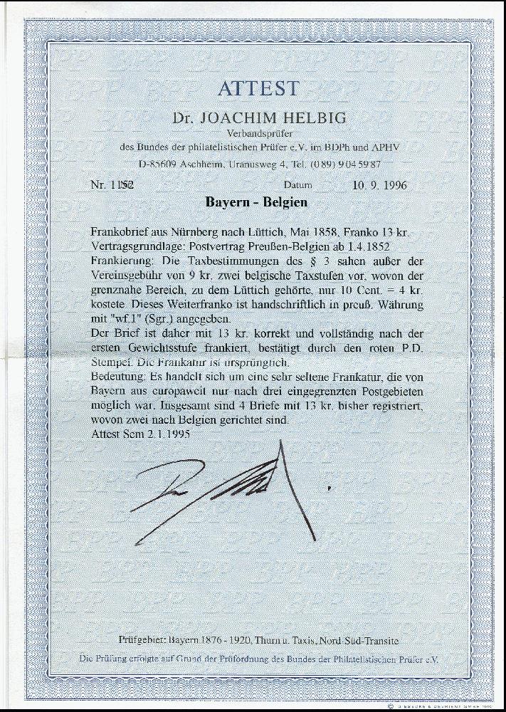 | Zusatzinformationen und Suchstichworte: | 371. Auktion Heinrich Köhler 24.-28. September 2019 Los 8156 BELGIEN: Quadratausgabe 1 Kreuzer dunkelrosa und 6 Kreuzer braun im waagerechten Paar vom linken Bogenrand, bei letzterem die rechte Marke unten leicht berührt, sonst alle voll- bis meist breitrandig, das Paar mit ca. 6 mm Bogenrand, jede Marke sauber entwertet durch oMR "356" auf Briefhülle mit nebengesetztem DKr. "NÜRNBERG 19 MAI 1858" nach Lüttich mit ausgewiesenem Weiterfranko von "1" Silbergroschen. Das Porto setzt sich zusammen aus 9 Kreuzer Vereinsgebühr und 4 Kreuzer belgischem Porto für den 1. Rayon; leichte Patina, sonst einwandfrei. Ein sehr seltenes 13 Kreuzer-Porto. Fotoattest Sem BPP (1995) und Dr. Helbig BPP (1996) Zuschlag 2.100,00 EUR |