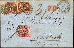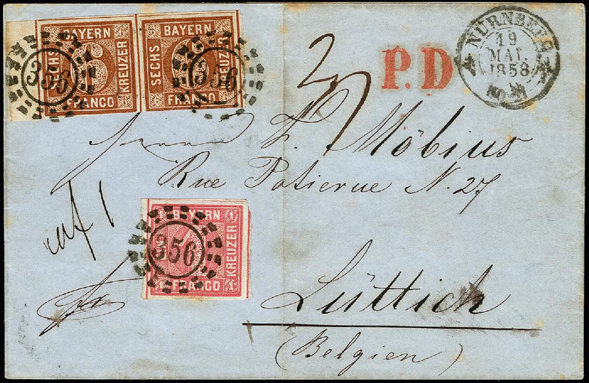 | Zusatzinformationen und Suchstichworte: | 371. Auktion Heinrich Köhler 24.-28. September 2019 Los 8156 BELGIEN: Quadratausgabe 1 Kreuzer dunkelrosa und 6 Kreuzer braun im waagerechten Paar vom linken Bogenrand, bei letzterem die rechte Marke unten leicht berührt, sonst alle voll- bis meist breitrandig, das Paar mit ca. 6 mm Bogenrand, jede Marke sauber entwertet durch oMR "356" auf Briefhülle mit nebengesetztem DKr. "NÜRNBERG 19 MAI 1858" nach Lüttich mit ausgewiesenem Weiterfranko von "1" Silbergroschen. Das Porto setzt sich zusammen aus 9 Kreuzer Vereinsgebühr und 4 Kreuzer belgischem Porto für den 1. Rayon; leichte Patina, sonst einwandfrei. Ein sehr seltenes 13 Kreuzer-Porto. Fotoattest Sem BPP (1995) und Dr. Helbig BPP (1996) Zuschlag 2.100,00 EUR |