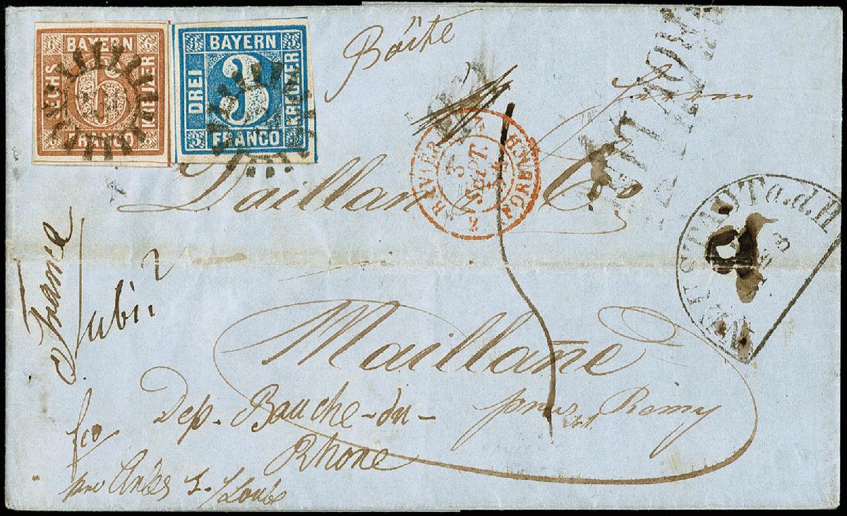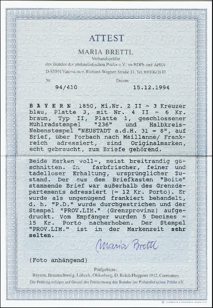 | Zusatzinformationen und Suchstichworte: | 371. Auktion Heinrich Köhler 24.-28. September 2019 Los 8164 FRANKREICH: 3 Kreuzer blau und 6 Kreuzer braun, beide voll- bis meist breitrandig mit gMR "236" und nebengesetztem Halbkreis "NEUSTADT a.d. H. 31=8" (1854) auf Briefhülle mit handschriftlichem "Boîte" sowie fälschlicherweise aufgesetztem "PROV. LIM." (Grenzprovinz) nach Maillane bei St. Remy im Departement Bouche du Rhone. Der Brief war frankiert für eine Destination in den Grenzdepartements, der Bestimmungsort lag jedoch in Südfrankreich, entsprechend war der Brief um 3 Kreuzer unterfrankiert, daher der Stempel "P.D." gestrichen und mit "5" Decimes (entsprechend 15 Kreuzern) nachbelastet. Ein interessantes Stück. Fotoattest Brettl BPP (1994) Zuschlag 150,00 EUR |