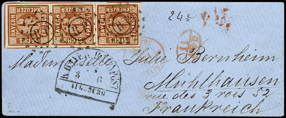 | Zusatzinformationen und Suchstichworte: | 371. Auktion Heinrich Köhler 24.-28. September 2019 Los 8165 FRANKREICH: 1850/58, 6 Kreuzer braun im senkrechten 3er-Streifen, allseits breitrandig mit praktisch vollständigen Zwischenlinien, aus der linken oberen Bogenecke stammend, mit klarem "P.D." auf kleinem Briefkuvert mit nebengesetztem Halbkreis "K.BAYER.BAHNPOST AUGSBURG 3 6" (1857) nach Mühlhausen im Elsaß mit nebengesetztem Ovalstempel "11 A.E.D."; ein schöner Brief in einwandfreier Erhaltung, signiert Pfenninger und Fotoattest Brettl BPP (1995) Zuschlag 650,00 EUR |
