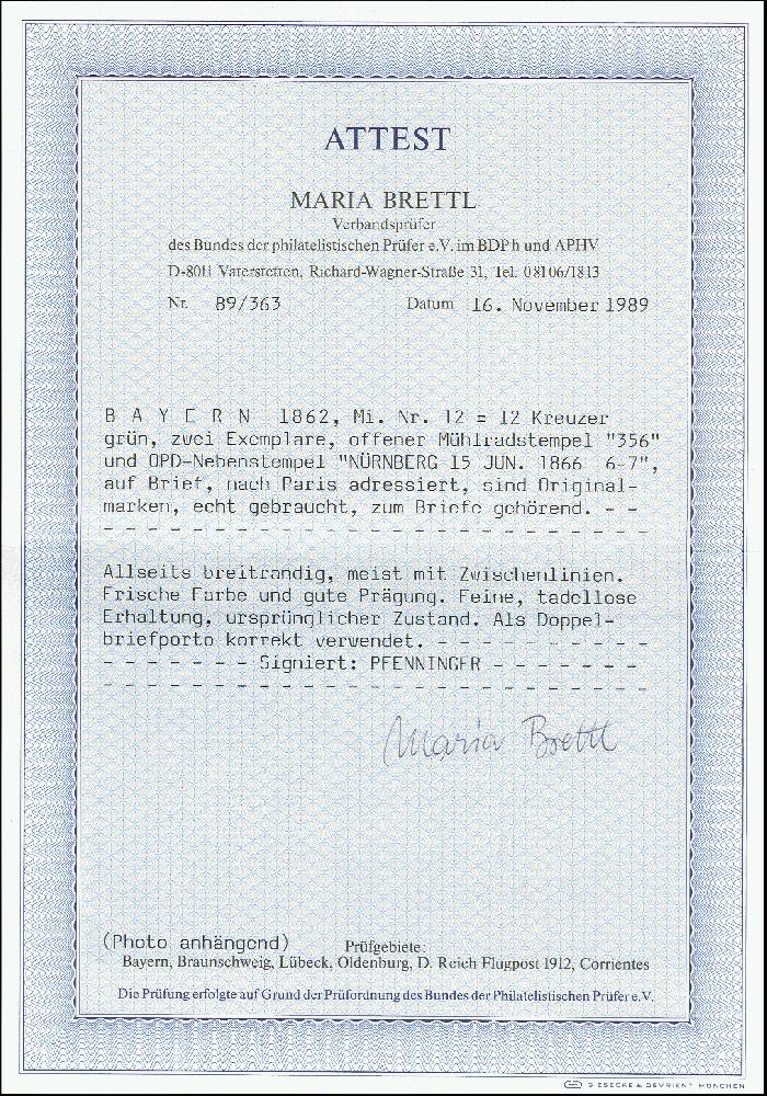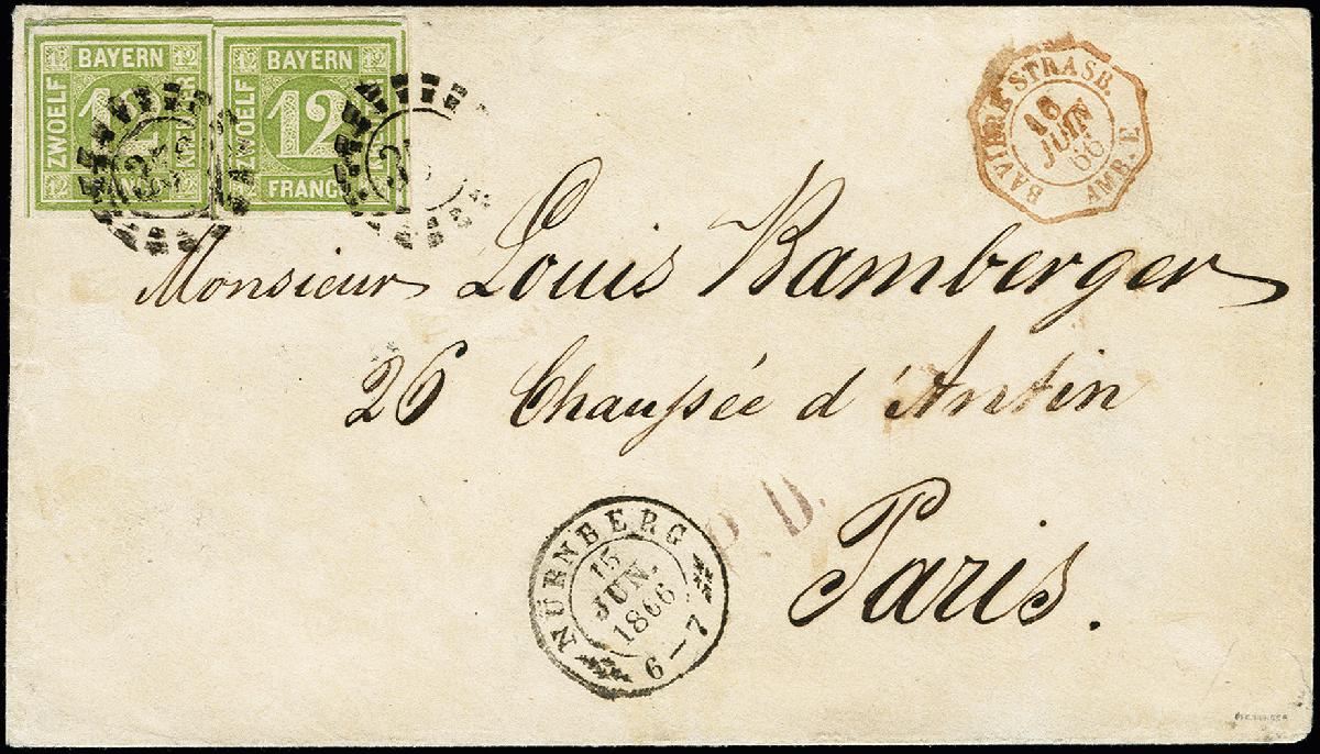 | Zusatzinformationen und Suchstichworte: | 371. Auktion Heinrich Köhler 24.-28. September 2019 Los 8167 FRANKREICH: 1862, 12 Kreuzer grün, 2 Einzelwerte, beide farbfrisch und allseits breitrandig, meist mit Zwischenlinien, der rechts klebende Wert aus der rechten oberen Bogenecke, mit oMR "356" und sauber nebengesetztem DKr. "NÜRNBERG 15 JUN. 1866" auf Briefkuvert der 2. Gewichtsstufe nach Paris mit vorderseitigem roten "BAVIERE STRASB. AMB.E"; das Kuvert minimale Beförderungsspuren und leichte Faltung außerhalb der Frankatur. Eine seltene und attraktive Mehrfachfrankatur; signiert Pfenninger und Fotoattest Brettl BPP (1989) Zuschlag 1.400,00 EUR |