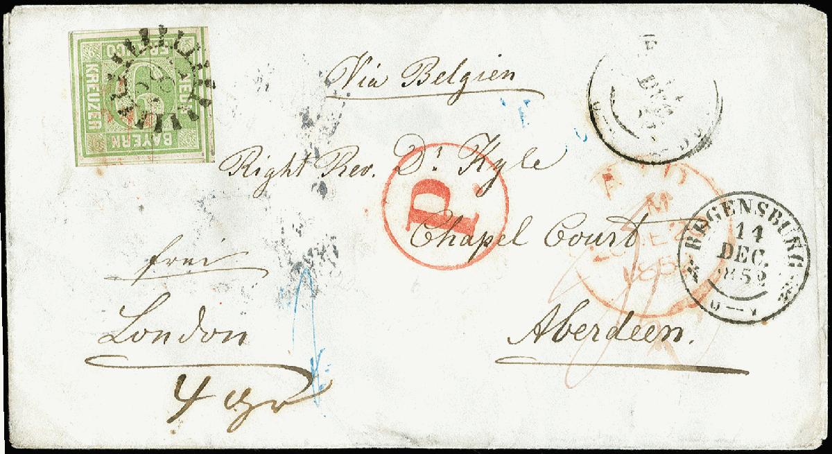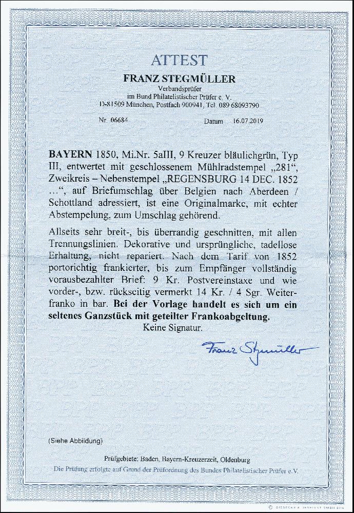 | Zusatzinformationen und Suchstichworte: | 371. Auktion Heinrich Köhler 24.-28. September 2019 Los 8171 GROSSBRITANNIEN: 9 Kreuzer bläulichgrün, allseits sehr breit- bis überrandig mit allen Zwischenlinien, mit gMR "281" und nebengesetztem DKr. "REGENSBURG 14 DEC. 1852" auf Briefkuvert nach Aberdeen in Schottland. Der Brief ist mit insgesamt 23 Kreuzern vollständig bezahlt, jedoch nur die Postvereinsgebühr verklebt, weitere 14 Kreuzer bar bezahlt und rückseitig notiert. Vorderseitig umgerechnet in "4" Silbergroschen. Ein attraktiver früher Auslandsbrief; wir haben keinen weiteren Brief mit geteiltem Franko nach Großbritannien registriert. Fotoattest Stegmüller BPP (2019) Zuschlag 1.000,00 EUR |