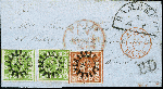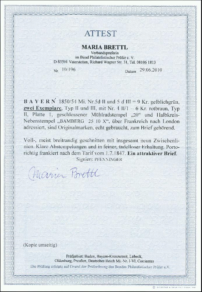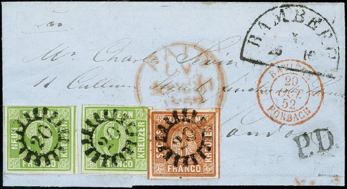 | Zusatzinformationen und Suchstichworte: | 371. Auktion Heinrich Köhler 24.-28. September 2019 Los 8173 GROSSBRITANNIEN: 1850/54, 6 Kreuzer braun und 2 Einzelwerte 9 Kreuzer gelblichgrün, davon einer in Type II, alle farbfrisch und voll- bis breitrandig mit gMR "20" und nebengesetztem Halbkreis "BAMBERG 25 10" (1852) auf kleinem Briefkuvert über Frankreich nach London mit teils auf die Frankatur übergehendem "PAID"-Stempel. Der Brief ist portogerecht frankiert nach dem Tarif vom 1.7.1847 mit 9 Kreuzer Vereinsporto und 15 Kreuzer Weiterfranko. Ein attraktiver früher Auslandsbrief in einwandfreier Erhaltung; signiert Pfenninger und Fotoattest Brettl BPP (2010) Zuschlag 1.100,00 EUR |