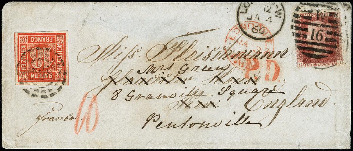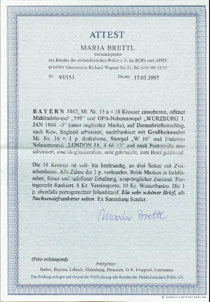 | Zusatzinformationen und Suchstichworte: | 371. Auktion Heinrich Köhler 24.-28. September 2019 Los 8175 18 Kreuzer zinnoberrot, sehr schön farbfrisch und voll- bis meist breitrandig mit Zwischenlinien an 3 Seiten, mit sauberem oMR "598" und nebengesetztem DKr. "WÜRZBURG 1. JAN 1866" (durch Nachsendefrankatur überklebt) auf kleinem Briefkuvert nach London und von hier nachgesandt nach Pentonville, frankiert mit 1 P. karmin mit Duplex "LONDON-W JA 4 66". Ein sehr attraktiver und in dieser Form außerordentlich seltener Brief in tadelloser Erhaltung. Zweifellos eine der schönsten Nachsendefrankaturen Bayerns; signiert Röhrl sowie Fotoattest Brettl BPP (1997) Provenienz: Georg Röhrl (Privatverkauf 1930), Jakob Sessler (... Lange & Fialkowski-Auktion, 1955) Zuschlag 9.500,00 EUR |