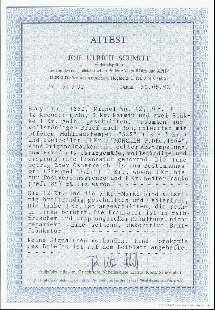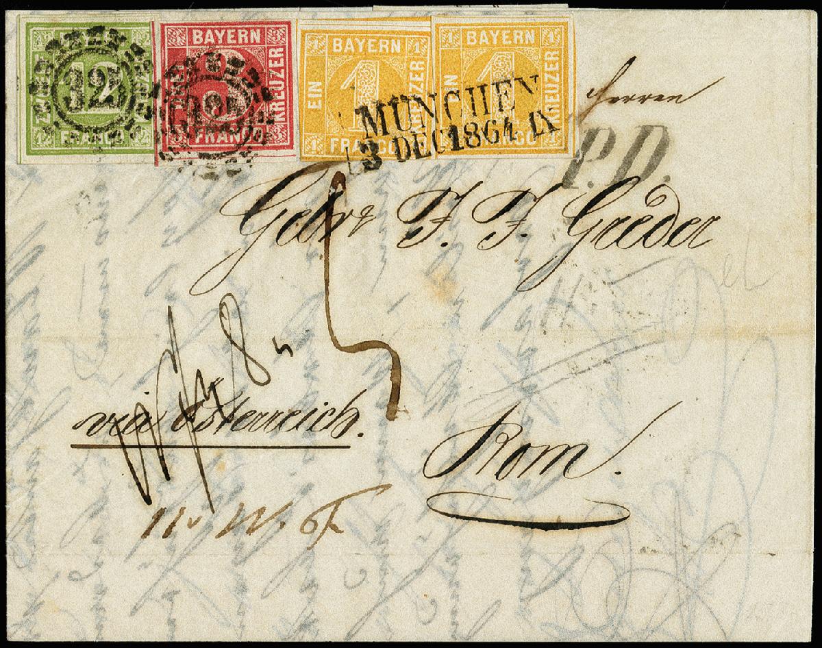 | Zusatzinformationen und Suchstichworte: | 371. Auktion Heinrich Köhler 24.-28. September 2019 Los 8183 1862, 12 Kreuzer grün, 3 Kreuzer karmin und 2 Einzelwerte 1 Kreuzer gelb, letztere beide etwas angeschnitten bzw. berührt, die beiden anderen Werte breitrandig und alle farbfrisch, sauber entwertet durch oMR "325" bzw. die beiden Kreuzer-Werte durch sauberen L2 "MÜNCHEN 3 DEC1864" auf Faltbrief über Österreich nach Rom, frankiert bis zur Kirchenstaatsgrenze mit 9 Kreuzern Vereinsporto und 8 Kreuzern italienischem Porto; die Inlandsgebühr im Kirchenstaat in Höhe von "5" Bajocchi wurde vom Empfänger eingezogen. Ein attraktiver Brief mit seltener Frankaturkombination in schöner ursprünglicher Erhaltung. Fotoattest Schmitt BPP (1992) Zuschlag 2.400,00 EUR |