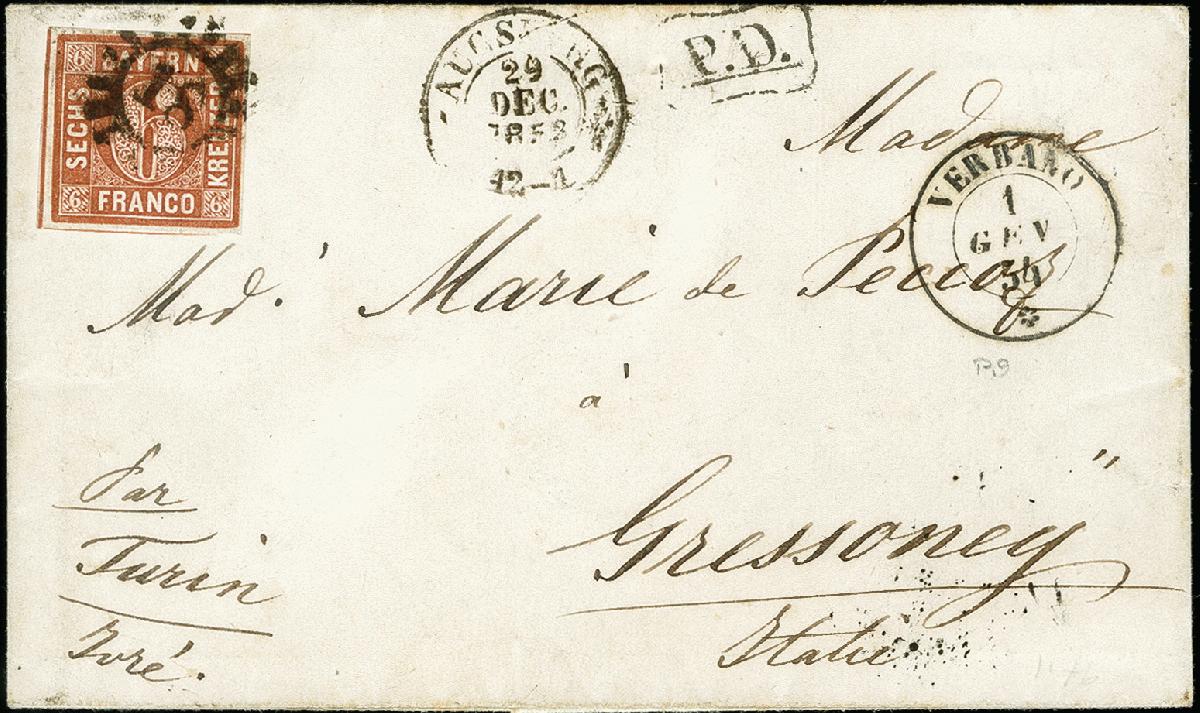 | Zusatzinformationen und Suchstichworte: | 371. Auktion Heinrich Köhler 24.-28. September 2019 Los 8187 SARDINIEN: 1850/58, 6 Kreuzer braun, voll- bis breitrandig mit gMR "18" und nebengesetztem DKr. "AUGSBURG 29 DEC. 1853" auf voll frankierter Briefhülle über die Schweiz mit vorderseitigem DKr. "VERBANO 1 GEV 54" der Schiffspost auf dem Lago Maggiore nach Gressoney bei Turin mit nebengesetztem Ra. "P.D.". Der Brief war mit 18 Kreuzern vollständig bezahlt, jedoch nur das Postvereinsporto frankiert, der Schweizer Transit sowie das sardische Porto von jeweils 6 Kreuzern bar bezahlt und rückseitig notiert. Ein sehr seltener und hochinteressanter Brief mit "geteiltem Franco" aus der Frühzeit des Auslands-Postverkehrs. Fotoattest Dr. Helbig BPP (1997) Zuschlag 1.400,00 EUR |