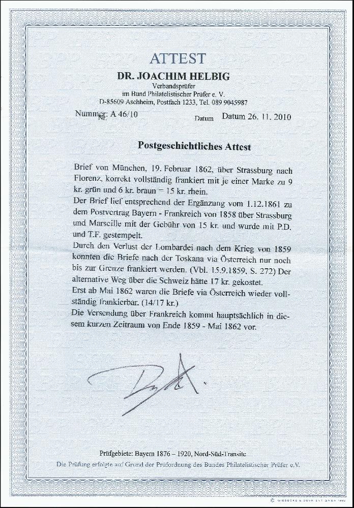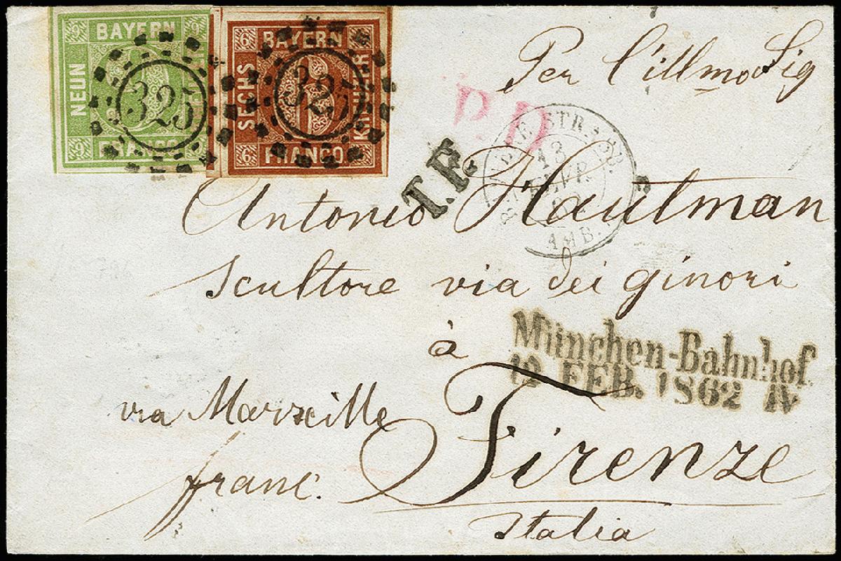 | Zusatzinformationen und Suchstichworte: | 371. Auktion Heinrich Köhler 24.-28. September 2019 Los 8198 KÖNIGREICH ITALIEN: 1850/58, 6 Kreuzer braun und 9 Kreuzer gelbgrün, farbfrisch und soweit sichtbar beide voll- bis breitrandig, die 6 Kreuzer mit Teil der linken Nachbarmarke (hier über die 9 Kreuzer geklebt), mit klarem oMR "325" und sauber nebengesetztem L2 "MÜNCHEN-BAHNHOF 19 FEB. 1862" auf kleinem Briefkuvert über Frankreich nach Florenz mit vorderseitigen Transitstempeln "T.F." und "P.D."; korrekt frankiert nach dem Tarif vom 1.12.1861. Schöne ursprüngliche Erhaltung; postgeschichtliches Attest Dr. Helbig BPP Zuschlag 600,00 EUR |