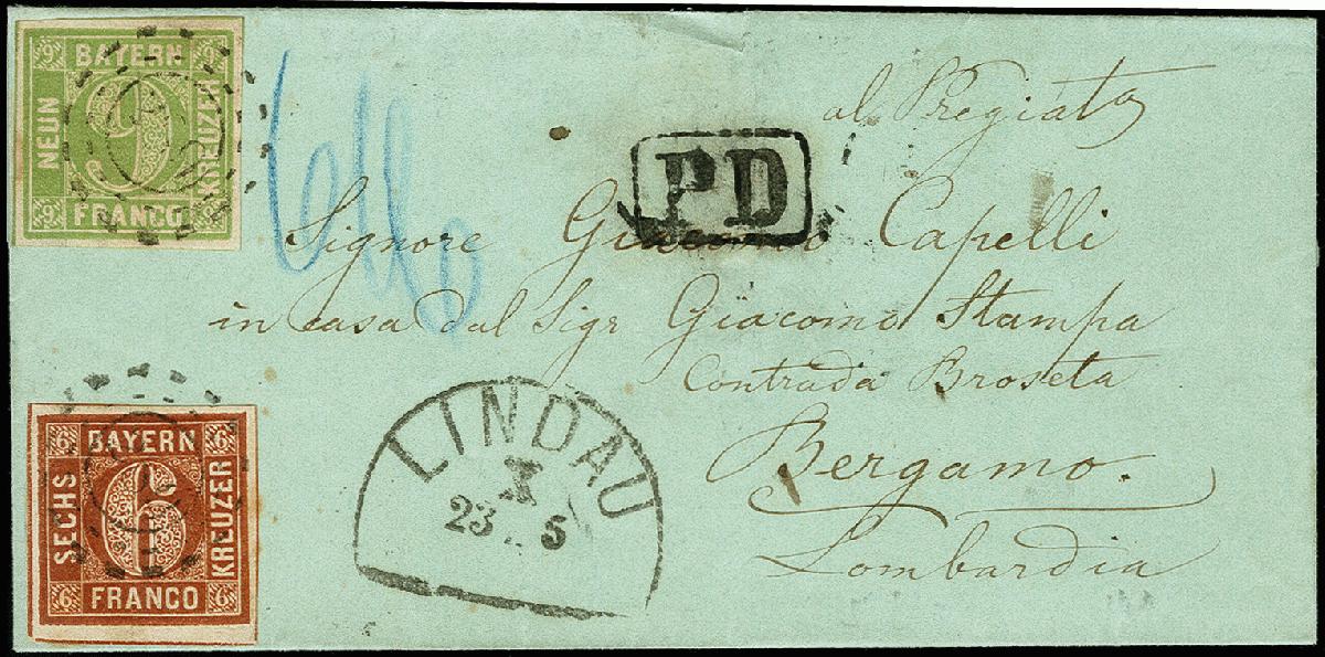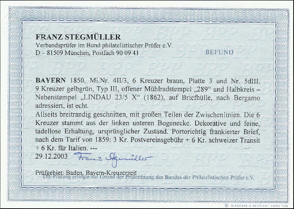 | Zusatzinformationen und Suchstichworte: | 371. Auktion Heinrich Köhler 24.-28. September 2019 Los 8199 6 Kreuzer braun, Platte 3 und 9 Kreuzer gelbgrün, beide farbfrisch und breitrandig geschnitten mit sauber aufgesetztem oMR "289" und nebengesetztem Halbkreis "LINDAU 23/5" (1862) auf kleiner Briefhülle über die Schweiz nach Bergamo, korrekt frankiert mit 3 Kreuzern Vereinsporto sowie jeweils 6 Kreuzern Schweizer Transit und italienischem Porto. Ein hübscher kleiner Brief in einwandfreier Erhaltung. Fotobefund Stegmüller BPP Zuschlag 360,00 EUR |